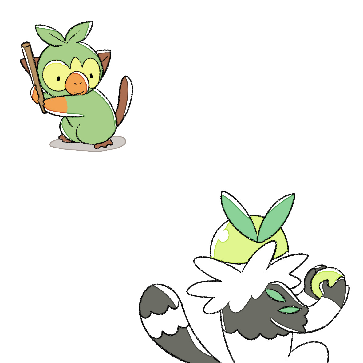 ball closed_mouth commentary dated english_commentary gen_7_pokemon gen_8_pokemon grookey holding holding_ball holding_stick nintendo nostrils passimian pokemon pokemon_(creature) pokemon_focus sicklizardman signature simple_background smile solid_oval_eyes stick white_background