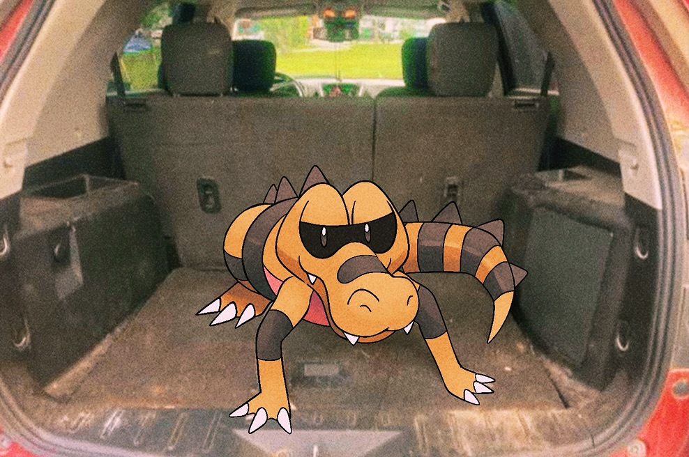 all_fours animal_focus car claws closed_mouth commentary crocodilian derivative_work desutroyah english_commentary fangs full_body gen_5_pokemon krokorok meme motor_vehicle nintendo no_humans nostrils photo-referenced photo_background pokemon pokemon_(creature) pokemon_focus solo spines vehicle_interior