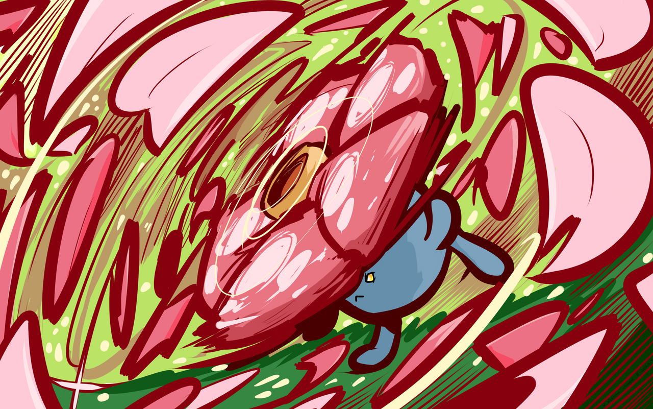 closed_mouth commentary commission english_commentary full_body gen_1_pokemon ishmam motion_blur nintendo no_humans painttool_sai_(medium) petal_dance_(pokemon) petals pink_petals pokemon pokemon_(creature) pokemon_focus pokemon_move solo standing standing_on_one_leg vileplume