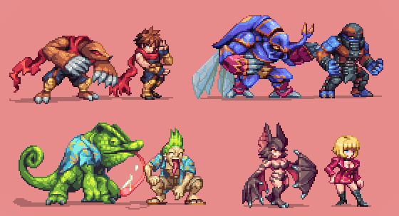 1girl 3boys abysswolf bat_girl bat_wings bloody_roar chameleon claws colored_skin furry furry_male green_skin hawaiian_shirt humanoid_and_humanization long_tongue multiple_boys pixel_art rhinoceros_beetle shirt tongue wings