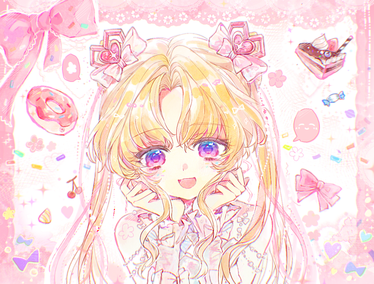 1girl arm_bow arm_warmers bare_shoulders bead_armlet beads blonde_hair border bow cake cake_slice candy chinese_commentary chocolate_cake cinnamon_stick commentary_request cone_hair_bun confetti donut double_bun dreamtime_bestowed_(infinity_nikki) dress eyelashes eyes_visible_through_hair food frilled_arm_warmers frilled_dress frills fruit hair_beads hair_bow hair_bun hair_ornament hair_ribbon hands_on_own_cheeks hands_on_own_face happy heart heart_hair_ornament infinity_nikki light_blush long_hair nikki_(series) open_mouth outline outside_border parted_bangs picture_frame pink_arm_warmers pink_border pink_bow pink_ribbon procreate_(medium) purple_eyes ribbon shuaige61505 sleeveless sleeveless_dress smile solo sparkle speech_bubble spoken_expression sprinkles straight-on strawberry twintails upper_body very_long_hair white_background white_dress white_outline