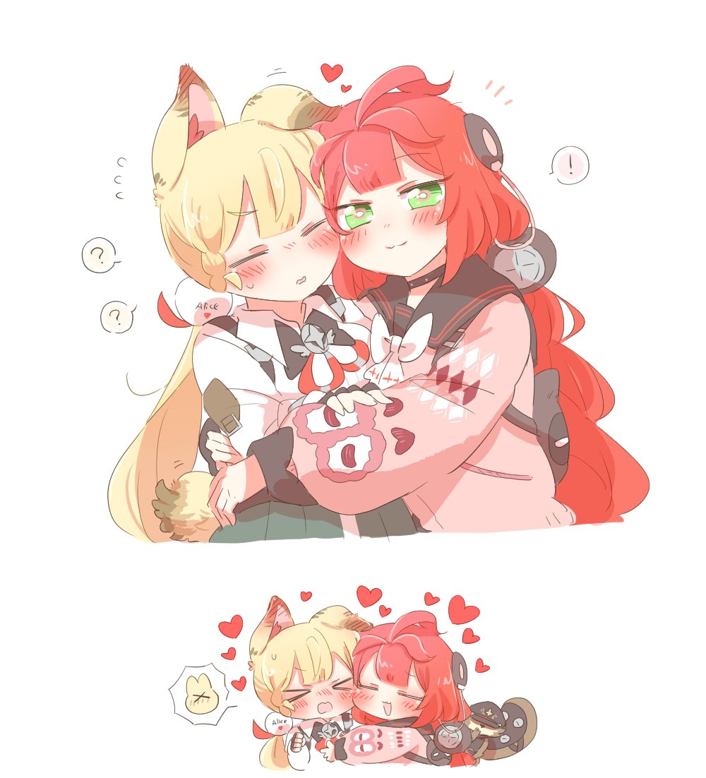 ! >_< 2girls ? alice_thymefield animal_ear_fluff animal_ears animal_on_back black_choker black_sailor_collar blonde_hair blush braid braided_twintails cardigan chest_bow choker closed_eyes closed_mouth commentary_request ear_blush flying_sweatdrops green_eyes green_skirt hair_ornament hearing_aid heart hug kamanosuke_(zenless_zone_zero) long_hair low_twintails multiple_girls open_mouth pink_cardigan rabbit_ears rabbit_girl rabbit_tail raccoon rebecca_(keinelove) red_hair sailor_collar shirt simple_background skirt smile sphere_hair_ornament spoken_exclamation_mark spoken_question_mark sweat sweatdrop tail tanuki twintails ukinami_yuzuha white_background white_shirt yuri zenless_zone_zero
