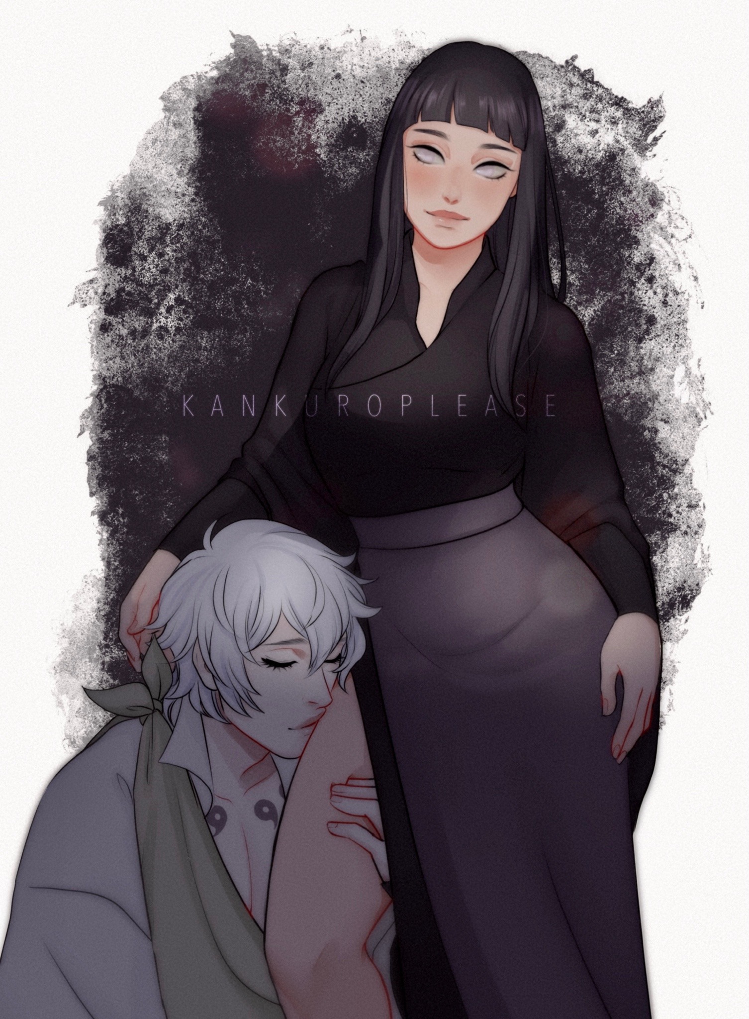 1boy 1girl alternate_costume artist_name black_dress blunt_bangs closed_eyes closed_mouth commentary couple curly_hair dress english_commentary hair_between_eyes hand_on_own_hip hetero high_collar highres hyuuga_hinata japanese_clothes kankuroplease kissing_thigh kneeling leaning_on_person leaning_to_the_side light_blush light_smile long_hair long_sleeves mitsudomoe_(shape) naruto:_the_last naruto_(series) no_pupils ootsutsuki_toneri pale_skin pink_lips purple_eyes purple_hair side_slit standing straight_hair thick_lips thick_thighs thighs tomoe_(symbol) upper_body watermark white_hair wide_hips