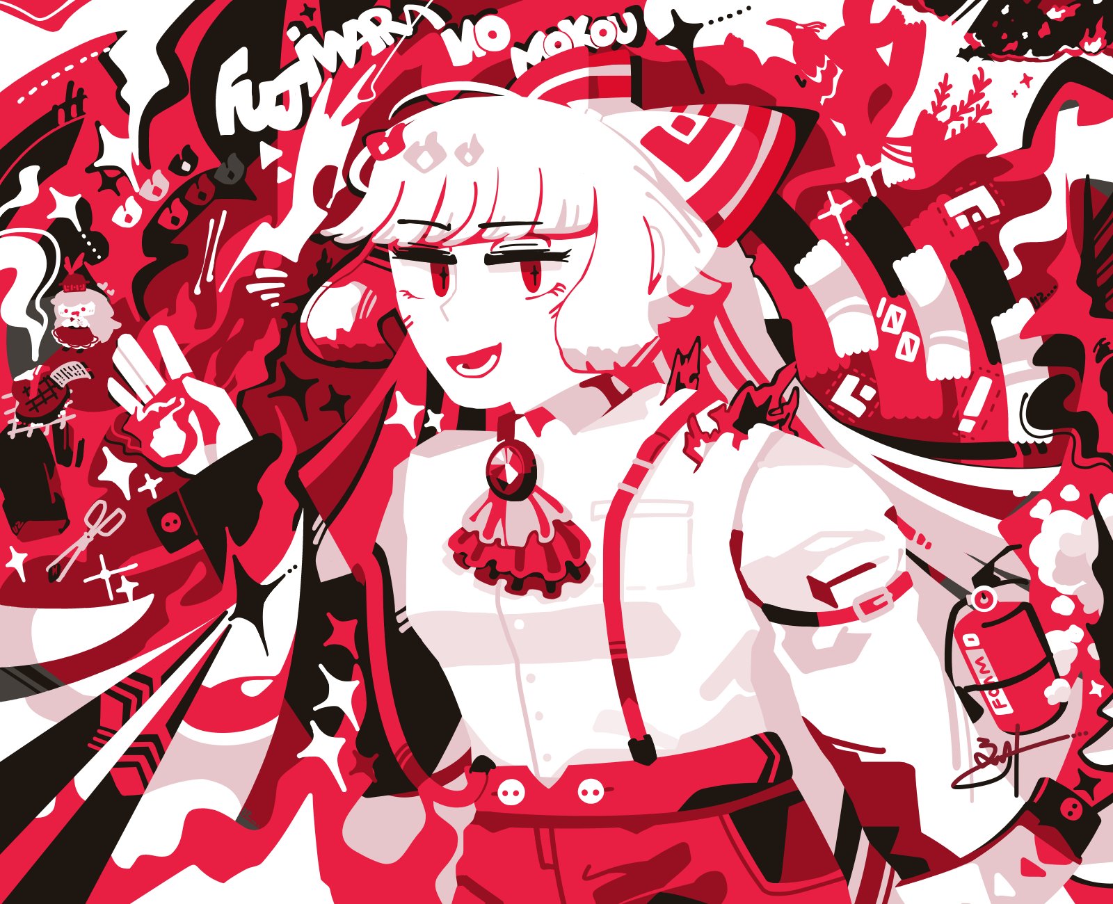 2girls abstract arm_belt bird blunt_bangs bow breast_pocket burning_clothes character_name chibi collared_shirt commentary cowboy_shot english_commentary english_text fire fire_extinguisher food fujiwara_no_mokou hair_bow hands_up highres kamishirasawa_keine limited_palette long_hair long_sleeves looking_at_viewer multiple_girls no_lineart open_mouth phoenix pocket pyrokinesis red_theme shirt sidelocks smile solo solo_focus sparkle steak suspenders thatpebble touhou