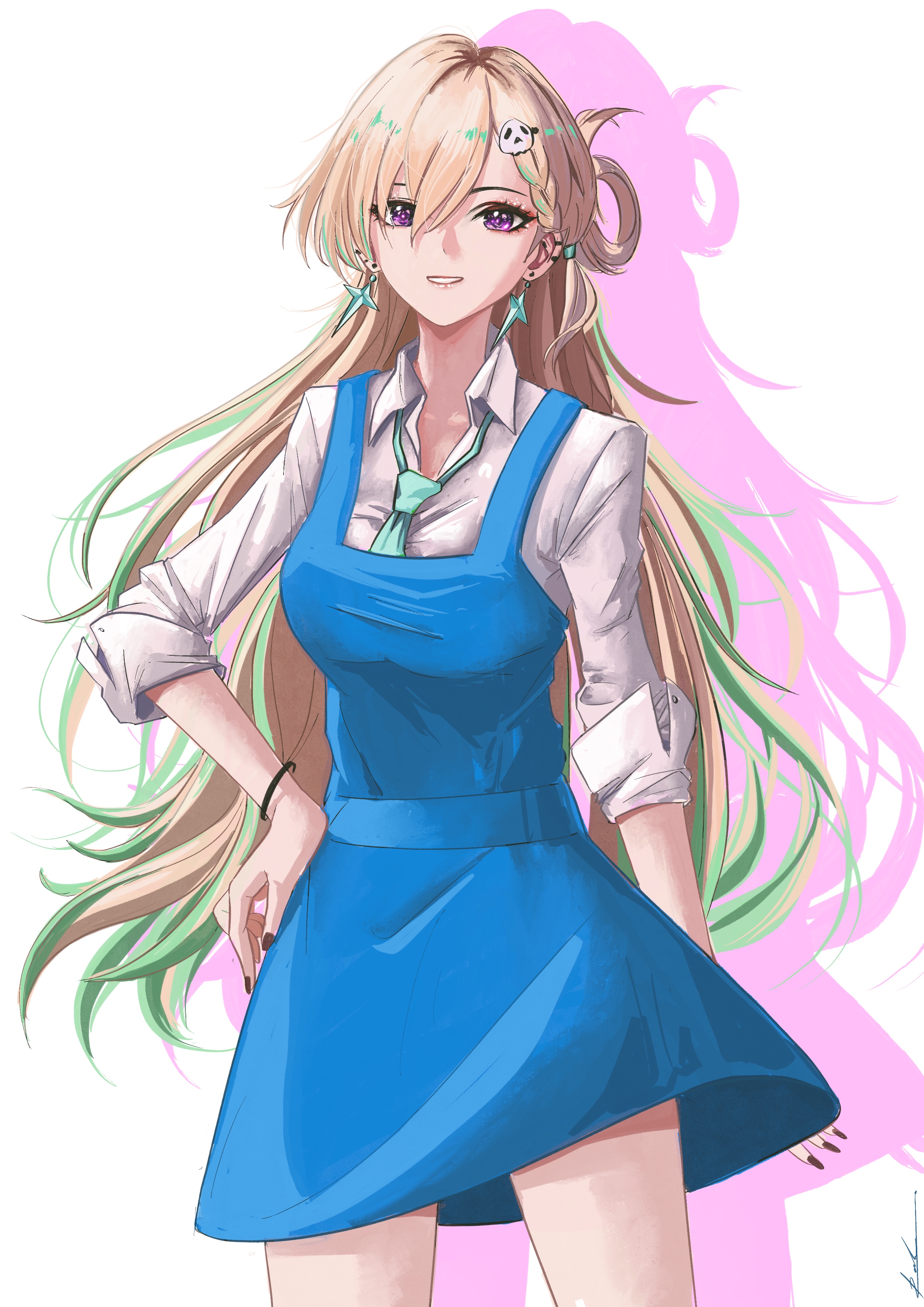 1girl absurdres blonde_hair blue_dress bracelet braid braided_bangs breasts collared_shirt commentary_request cowboy_shot double-parted_bangs dress drop_shadow earrings green_necktie green_streaks hair_between_eyes hair_ornament hand_on_own_hip highres jewelry long_hair looking_at_viewer lynae_(wuthering_waves) medium_breasts multicolored_hair necktie parted_lips pinafore_dress purple_eyes shirt simple_background skull_hair_ornament sleeveless sleeveless_dress smile solo star_(symbol) star_earrings streaked_hair thelotter92 white_background white_shirt wuthering_waves