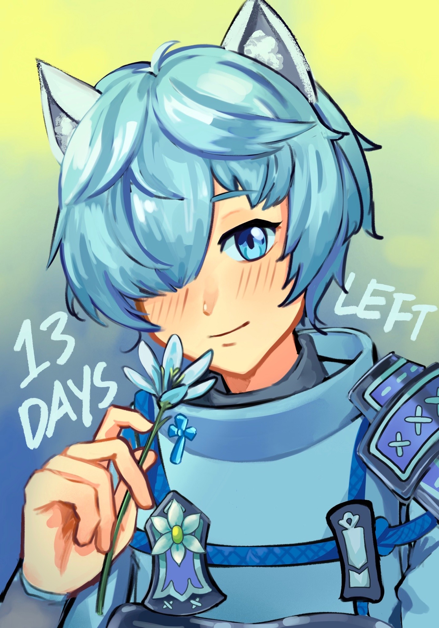 1boy animal_ears armor blue_eyes closed_mouth countdown fubuki_(rune_factory) hair_over_one_eye highres japanese_armor looking_at_viewer male_focus rune_factory rune_factory:_guardians_of_azuma ryuuseirune second-party_source short_hair smile solo wolf_boy wolf_ears