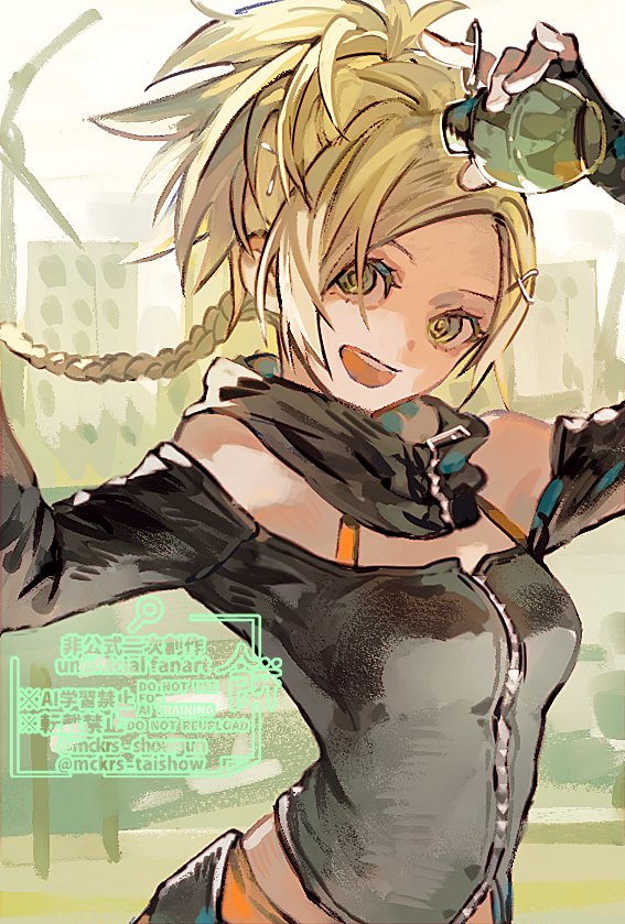 1girl blonde_hair commentary_request dissidia_duellum_final_fantasy dissidia_final_fantasy explosive final_fantasy final_fantasy_x fingerless_gloves gloves green_eyes grenade looking_at_viewer mckrs official_alternate_costume open_mouth rikku_(ff10) solo teeth upper_teeth_only zipper