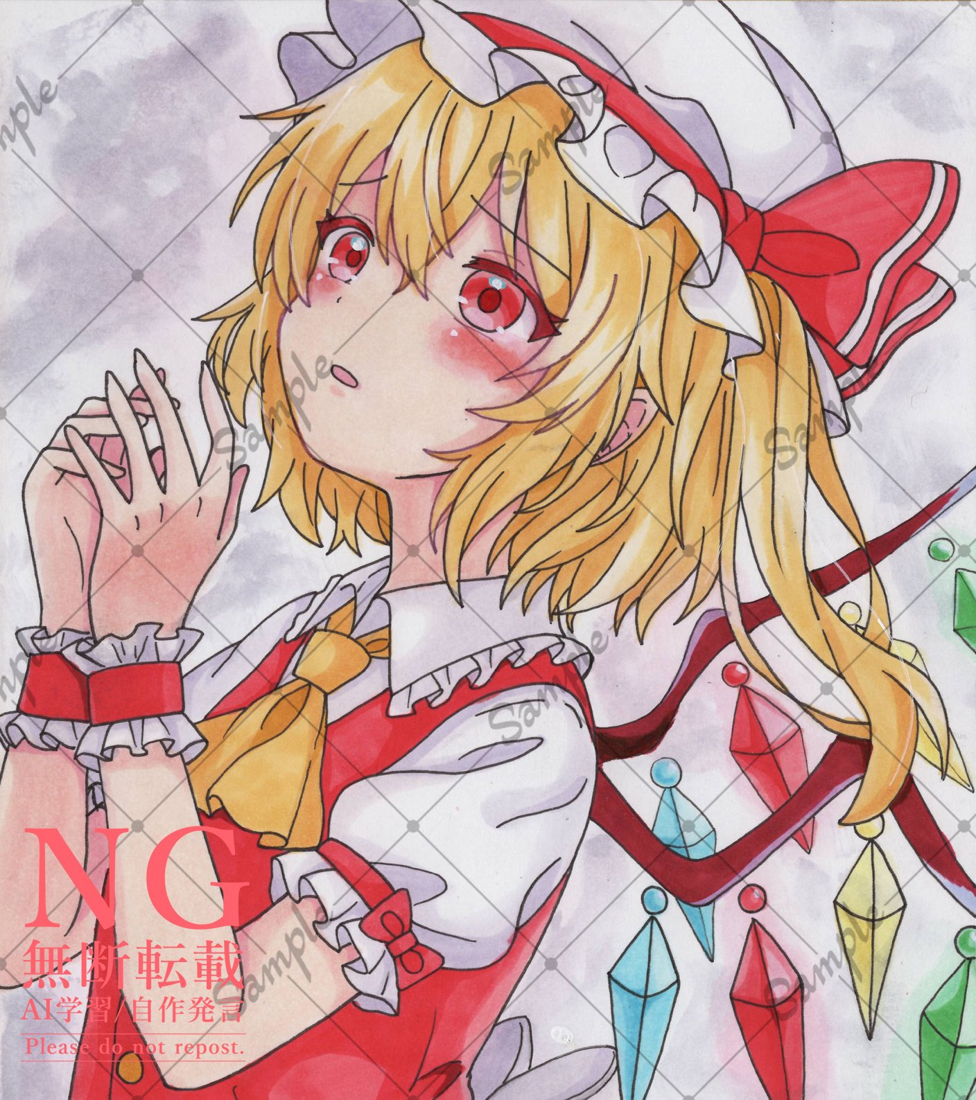 1girl ascot blonde_hair blush bow collared_shirt commentary_request crystal crystal_wings flandre_scarlet frilled_shirt_collar frilled_wrist_cuffs frills hat highres hoshi_tea_party mob_cap multicolored_wings one_side_up puffy_short_sleeves puffy_sleeves red_bow red_eyes red_skirt red_vest red_wrist_cuffs sample_watermark shirt short_sleeves skirt skirt_set sleeve_bow solo touhou traditional_media vest watermark watermark_grid white_hat white_shirt wings wrist_cuffs yellow_ascot