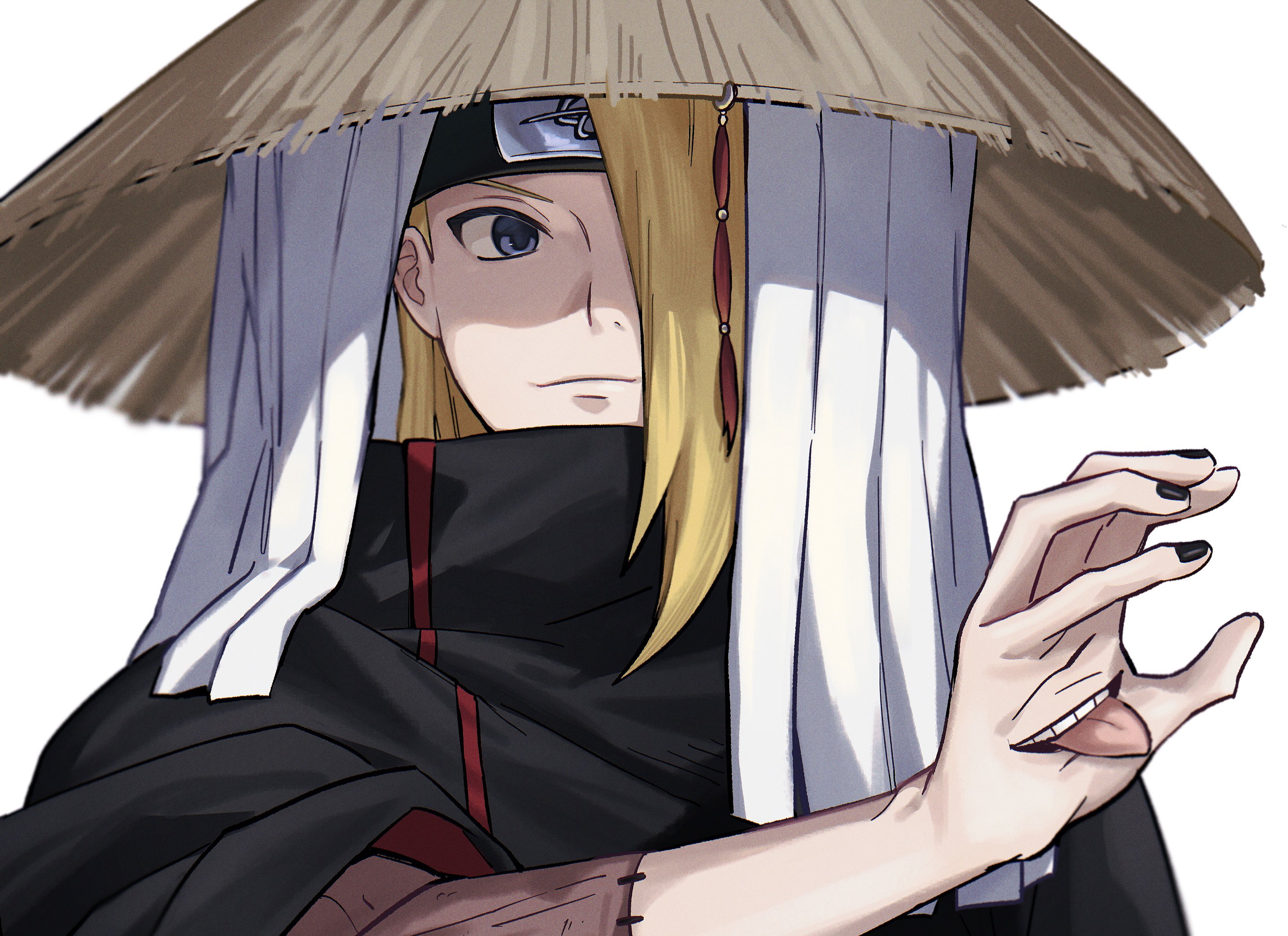 1boy akatsuki_uniform black_coat black_nails blonde_hair blue_eyes brown_hat closed_mouth coat commentary_request deidara_(naruto) forehead_protector hair_over_one_eye hand_mouth hat highres iwagakure_symbol male_focus naruto_(series) naruto_shippuuden smile solo stitched_arm stitches straw_hat tongue upper_body white_background xxx_oi7