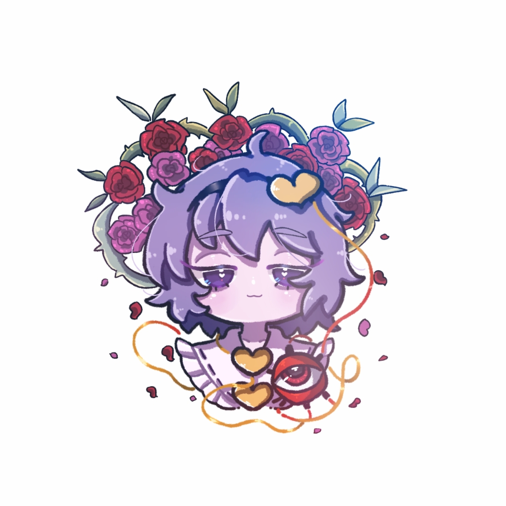 1girl :3 black_hairband buttons closed_mouth commentary_request eyeball falling_petals flower frilled_shirt_collar frills hair_ornament hairband hakunemui heart heart_button heart_hair_ornament komeiji_satori looking_at_viewer petals plant portrait purple_eyes purple_hair red_flower red_petals red_rose ribbon-trimmed_collar ribbon_trim rose simple_background smile smug solo third_eye touhou vines white_background