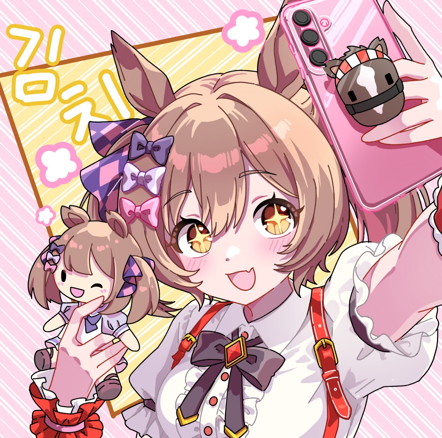 +_+ 1girl animal_ears argyle_bow bin_ze_u black_bow blush bow bowtie breasts brown_eyes brown_hair cellphone cellphone_charm center_frills character_doll charm_(object) commentary_request doll fang frills hair_between_eyes hair_bow hair_ornament highres holding holding_doll holding_phone horse_ears horse_girl korean_commentary medium_hair open_mouth outstretched_arm phone pink_bow puffy_short_sleeves puffy_sleeves purple_bow purple_bowtie purple_shirt sailor_collar sailor_shirt school_uniform selfie shirt short_sleeves skin_fang skirt smart_falcon_(love_4ever)_(umamusume) smart_falcon_(racehorse) smart_falcon_(umamusume) smile solo suspenders tracen_school_uniform twintails umamusume white_sailor_collar white_shirt white_skirt wrist_cuffs