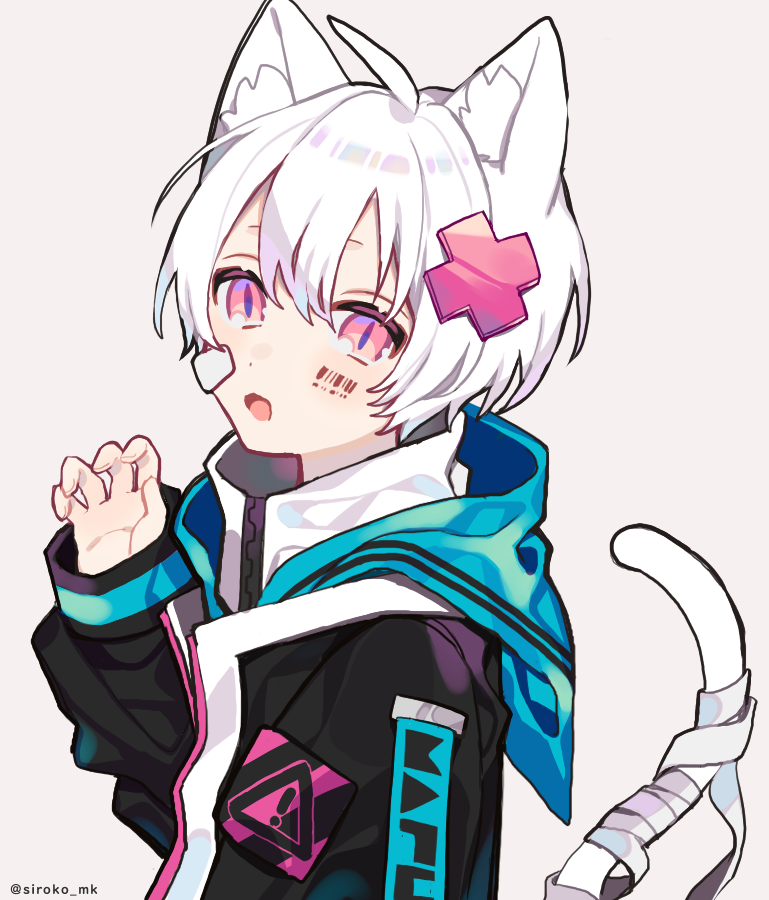 1boy ahoge animal_ear_fluff animal_ears barcode barcode_tattoo black_jacket cat_boy cat_ears cat_tail commentary double-parted_bangs hair_between_eyes hair_ornament hand_up indie_utaite jacket long_sleeves mafumafu male_focus open_clothes open_jacket open_mouth pink_eyes shiroko_(purinkirin) shirt short_hair simple_background slit_pupils solo tail tattoo upper_body utaite white_background white_hair white_shirt x_hair_ornament