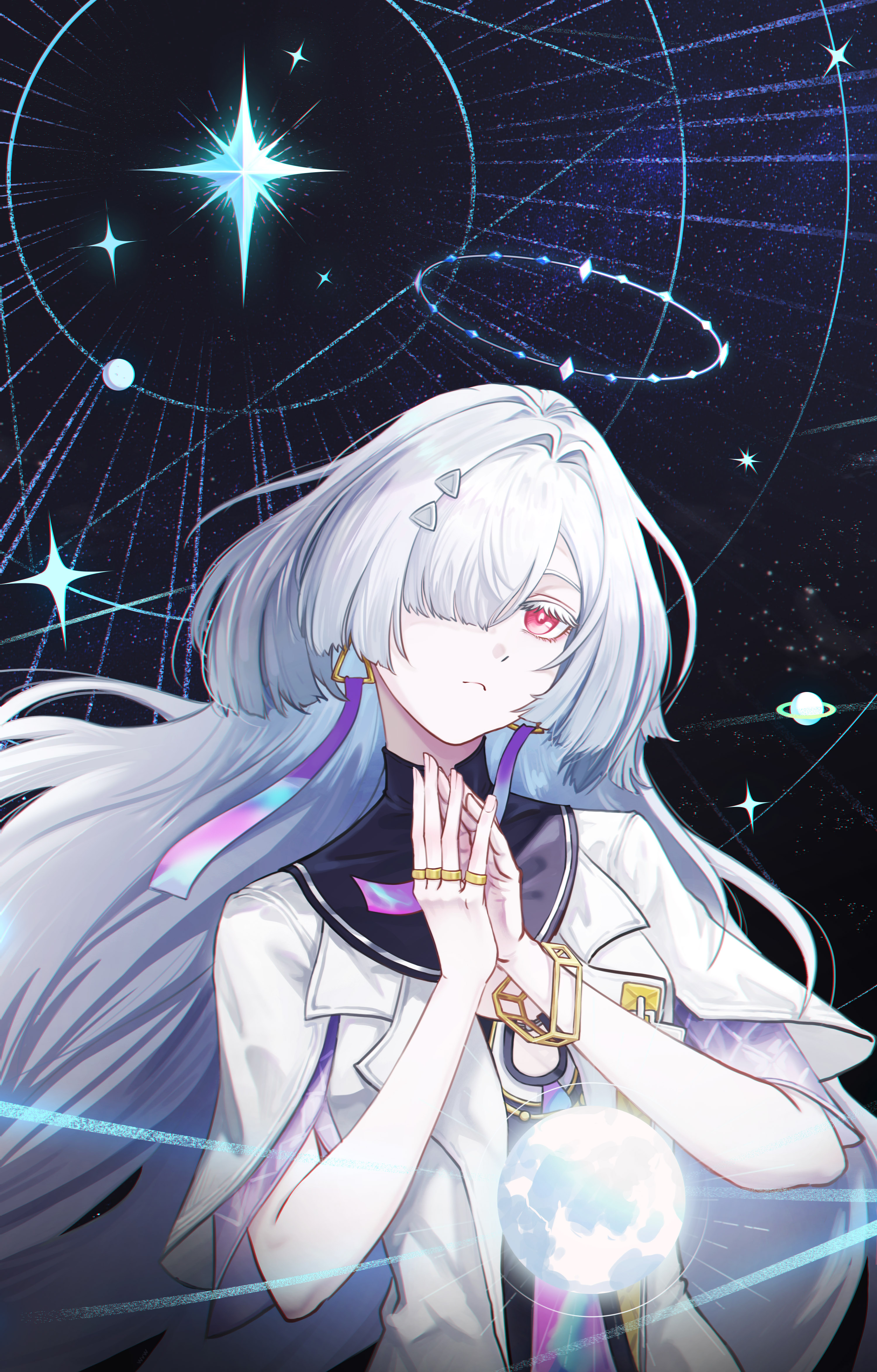 1girl :< absurdres black_background chinese_commentary closed_mouth colored_eyelashes commentary_request earrings hair_over_one_eye halo hands_up highres jacket jewelry long_hair looking_at_viewer mornye_(wuthering_waves) one_eye_covered own_hands_together planet red_eyes short_sleeves solo sparkle star_(sky) triangle_earrings upper_body white_jacket wuthering_waves wvw