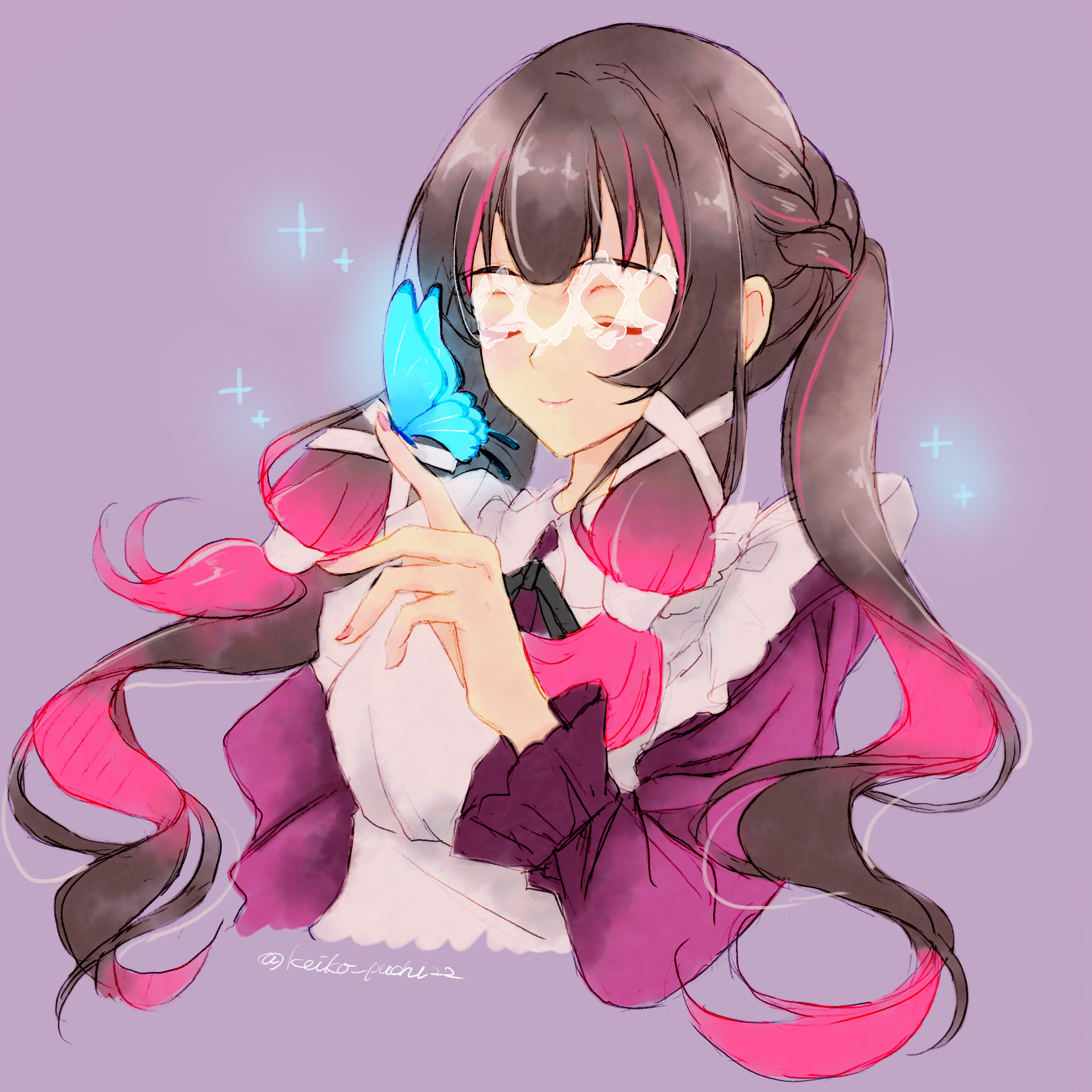 1girl alternate_costume alternate_hairstyle black_hair blue_butterfly braid bug butterfly butterfly_on_hand closed_eyes closed_mouth columbina_(genshin_impact) commentary_request cropped_torso dress eye_mask genshin_impact hand_up highres insect keiko_puchi22 long_hair long_sleeves mask multicolored_hair pink_hair purple_background purple_dress ribbon simple_background smile solo streaked_hair twintails twitter_username two-tone_hair upper_body white_ribbon