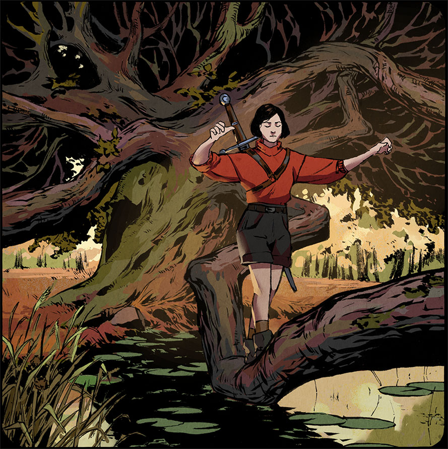 1girl balancing black_hair black_shorts boots closed_eyes closed_mouth commentary concentrating elena_kononenko english_commentary full_body grass hands_up lily_pad on_branch original outstretched_arms red_sweater short_hair shorts solo spread_arms sweater sword sword_on_back three-quarter_sleeves tree turtleneck turtleneck_sweater walking weapon weapon_on_back wetland
