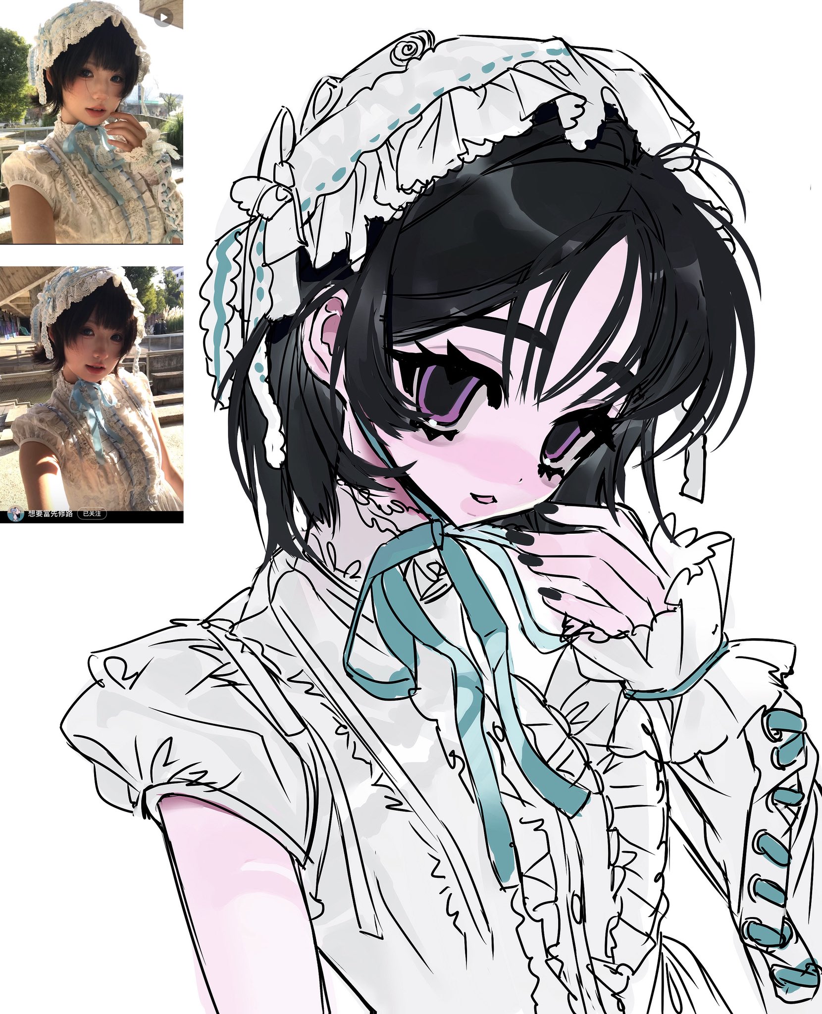 1girl alien_stage alternate_costume black_hair black_nails center_frills chinese_commentary commentary dress frills hat highres medium_hair photo-referenced photo_inset purple_eyes reference_inset solo sua_(alien_stage) taowu_(20809) white_dress white_hat