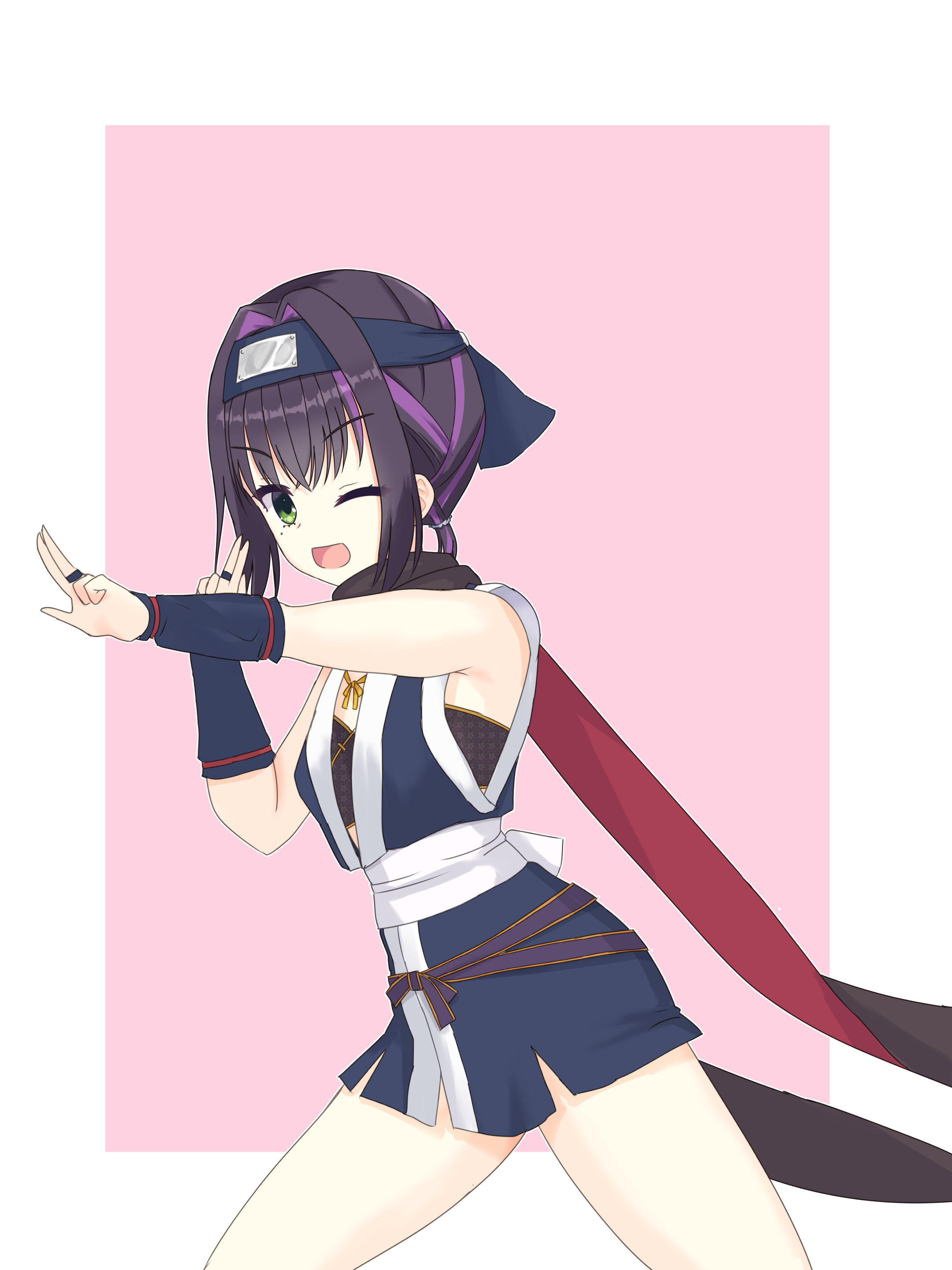 1girl ;d absurdres armor black_hair black_scarf blue_bridal_gauntlets blue_kimono border breastplate breasts bridal_gauntlets commentary_request company_connection cosplay cowboy_shot crossed_bangs fighting_stance forehead_protector green_eyes hair_between_eyes hair_intakes hands_up highres hitachi_mako hitachi_mako_(cosplay) japanese_clothes kimono kuji-in limelight_lemonade_jam long_scarf looking_at_viewer medium_hair mole mole_under_eye multicolored_hair nabari_anju ninja one_eye_closed open_mouth outline outside_border pink_background purple_streaks red_scarf scarf senren_banka shirayamakoma sidelocks simple_background sleeveless sleeveless_kimono small_breasts smile solo standing streaked_hair two-sided_scarf v-shaped_eyebrows white_border white_outline yuzusoft