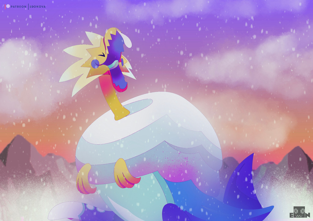 animal_focus arctozolt cloud commentary edo_nova english_commentary gen_8_pokemon medibang_paint_(medium) mixed-language_commentary nintendo no_humans outdoors patreon_logo patreon_username pokemon pokemon_(creature) pokemon_focus procreate_(medium) sky snowing solo spanish_commentary