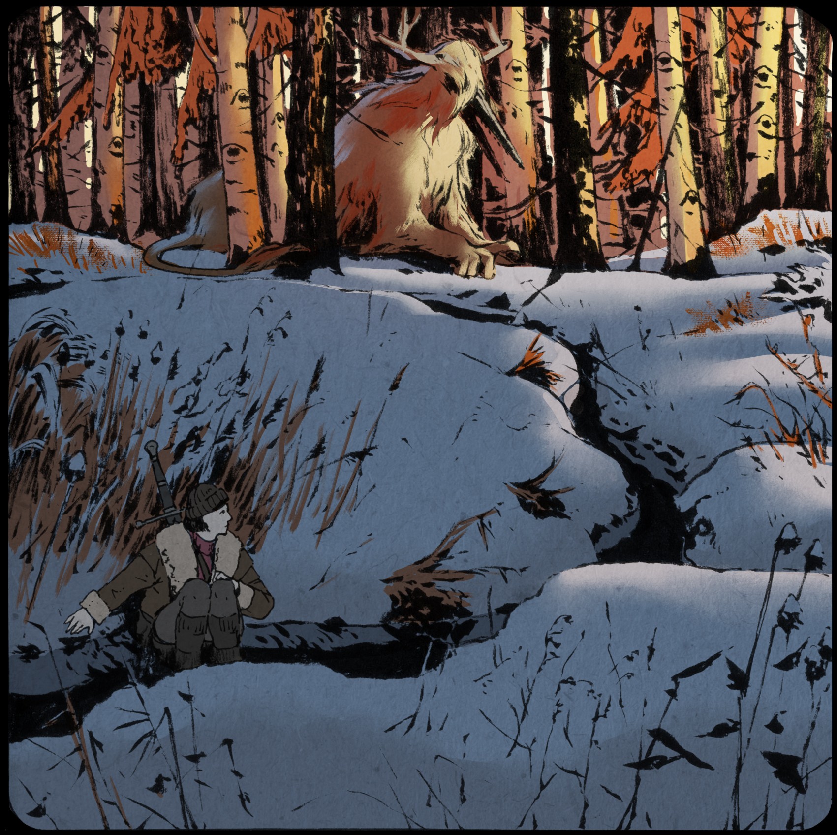 1other androgynous beanie black_border black_hair black_hat border brown_jacket commentary day elena_kononenko english_commentary foliage forest grey_pants hat hiding highres jacket looking_to_the_side monster nature open_clothes open_jacket original outdoors pants red_sweater scenery snow squatting stream sweater sword sword_on_back tree turning_head weapon weapon_on_back winter