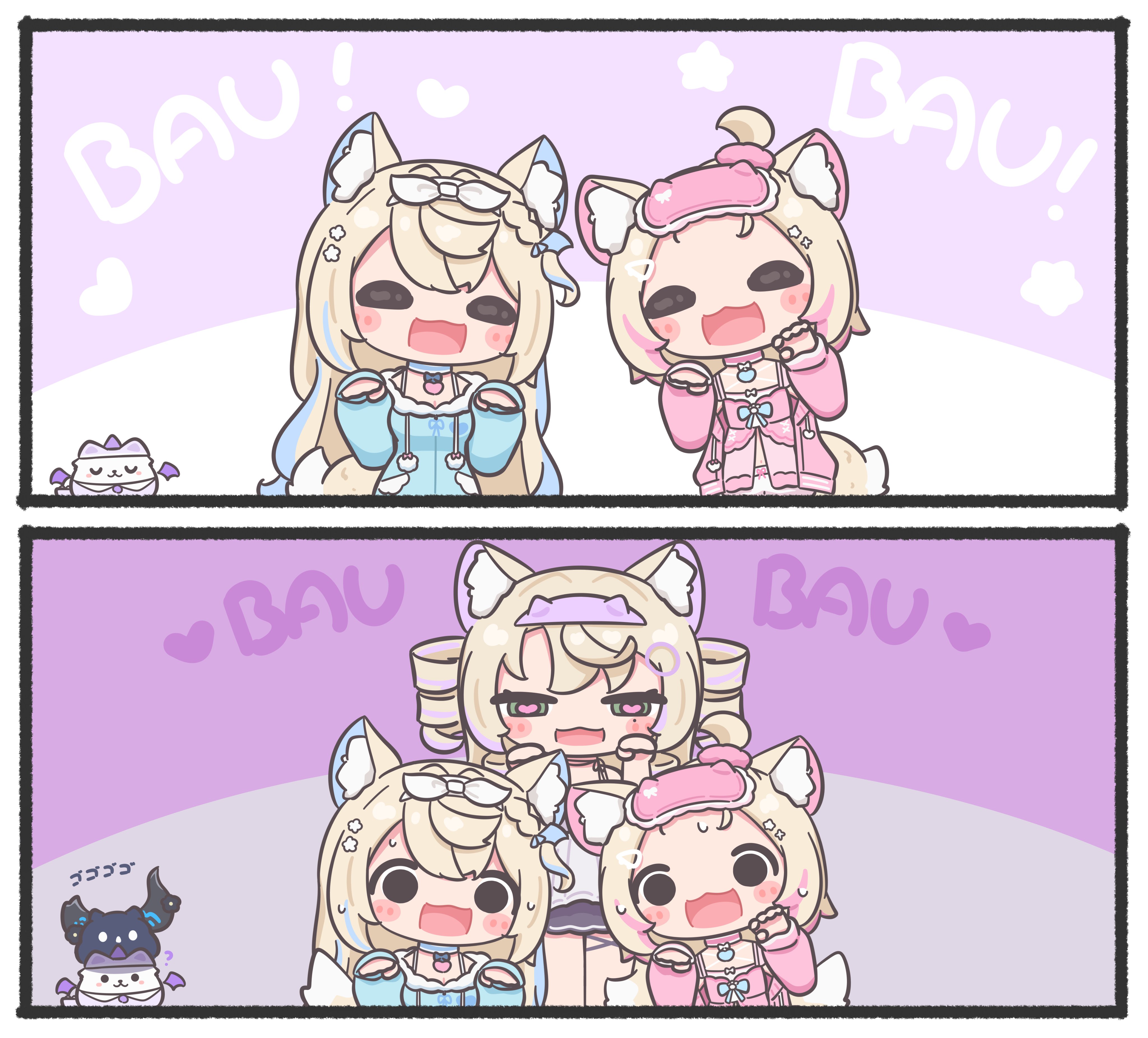 3girls absurdres animal_ears babydoll blonde_hair blue_babydoll blue_streaks breasts dog_ears dog_girl dog_tail drill_hair fuwawa_abyssgard fuwawa_abyssgard_(pajamas) green_eyes heart heart-shaped_pupils highres hololive hololive_english jailbird_(nerissa_ravencroft) long_hair looking_at_viewer mococo_abyssgard mococo_abyssgard_(pajamas) mofufu_(nerissa_ravencroft) mpien multicolored_hair multiple_girls nerissa_ravencroft perroccino_(fuwamoco) pink_babydoll pink_streaks shirt short_hair siblings sisters sleep_mask streaked_hair symbol-shaped_pupils tail twin_drills virtual_youtuber