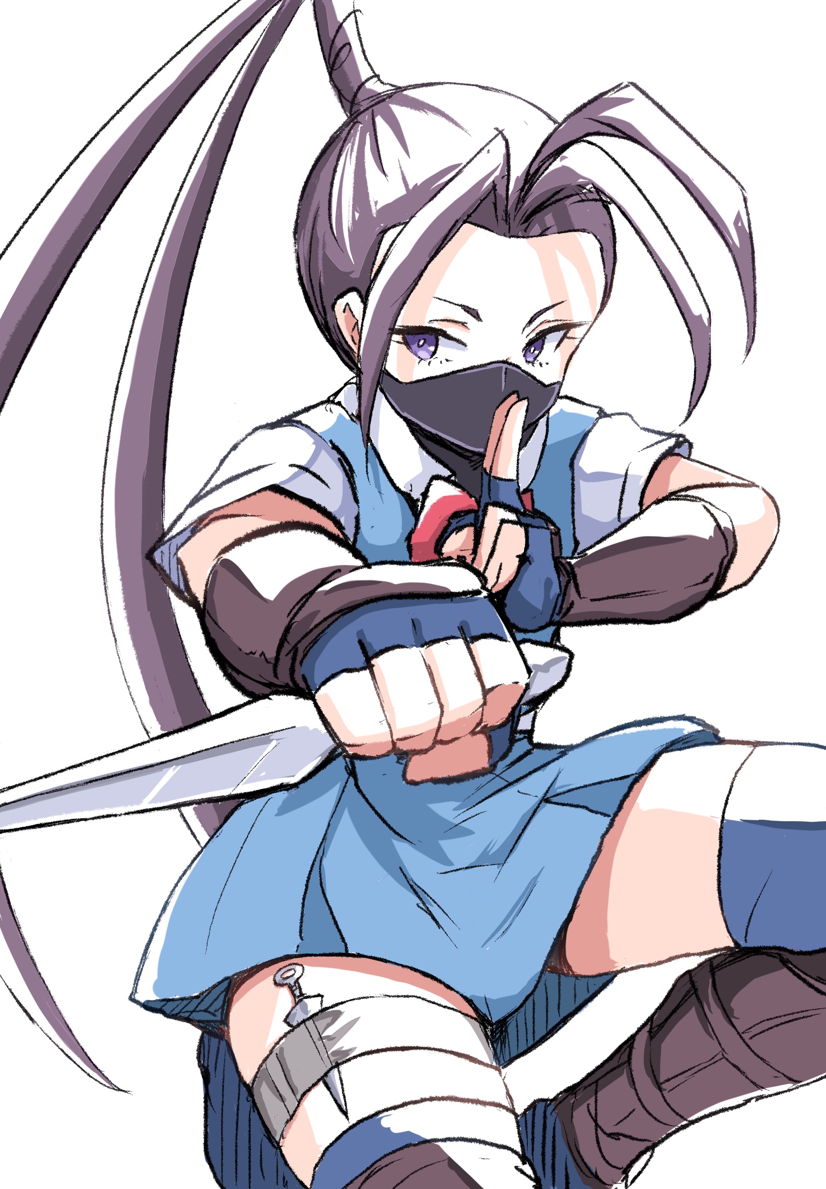 1girl blue_dress bright_pupils commentary_request dress eyelashes high_ponytail highres holding holding_weapon ibuki_(street_fighter) ikaringo_(ikaringo4444) kunai looking_to_the_side mask mouth_mask ninja ponytail purple_eyes simple_background solo street_fighter street_fighter_iii_(series) weapon white_background white_pupils