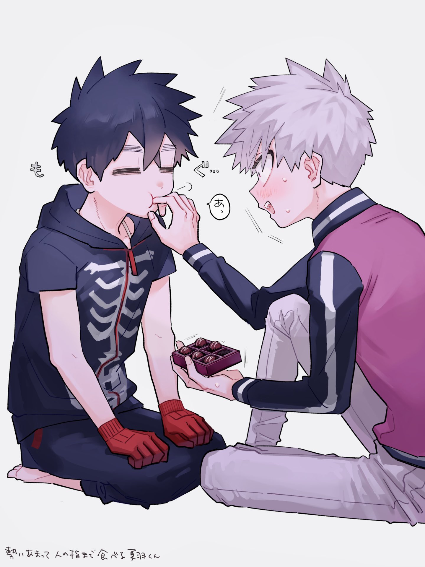 2boys barefoot black_hair blush chocolate feeding finger_in_another's_mouth food gloves highres hood hooded_jacket jacket kemono_jihen knee_up kusaka_kabane long_sleeves male_focus multiple_boys pants red_gloves seiza short_hair sitting skeleton_print sweatdrop tademaru_shiki wao_(77_af5) yaoi