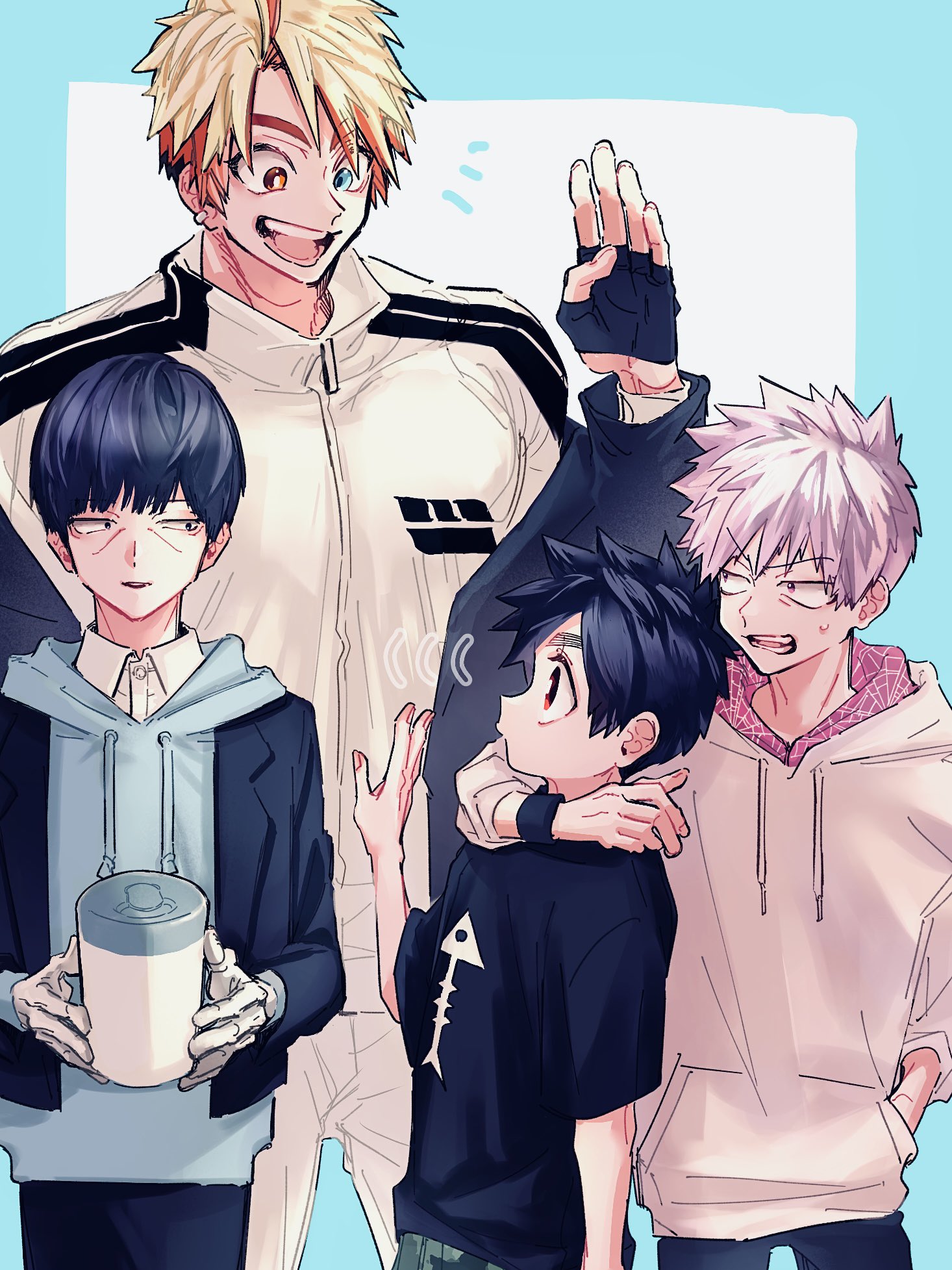 4boys akagi_kazuaki arm_around_neck black_hair blonde_hair fingerless_gloves gloves hanagata_kaede heterochromia high_collar highres hood hoodie jacket kemono_jihen kusaka_kabane looking_at_another male_focus multiple_boys open_mouth pink_hair short_hair smile tademaru_shiki teeth wao_(77_af5) waving wet_wipes