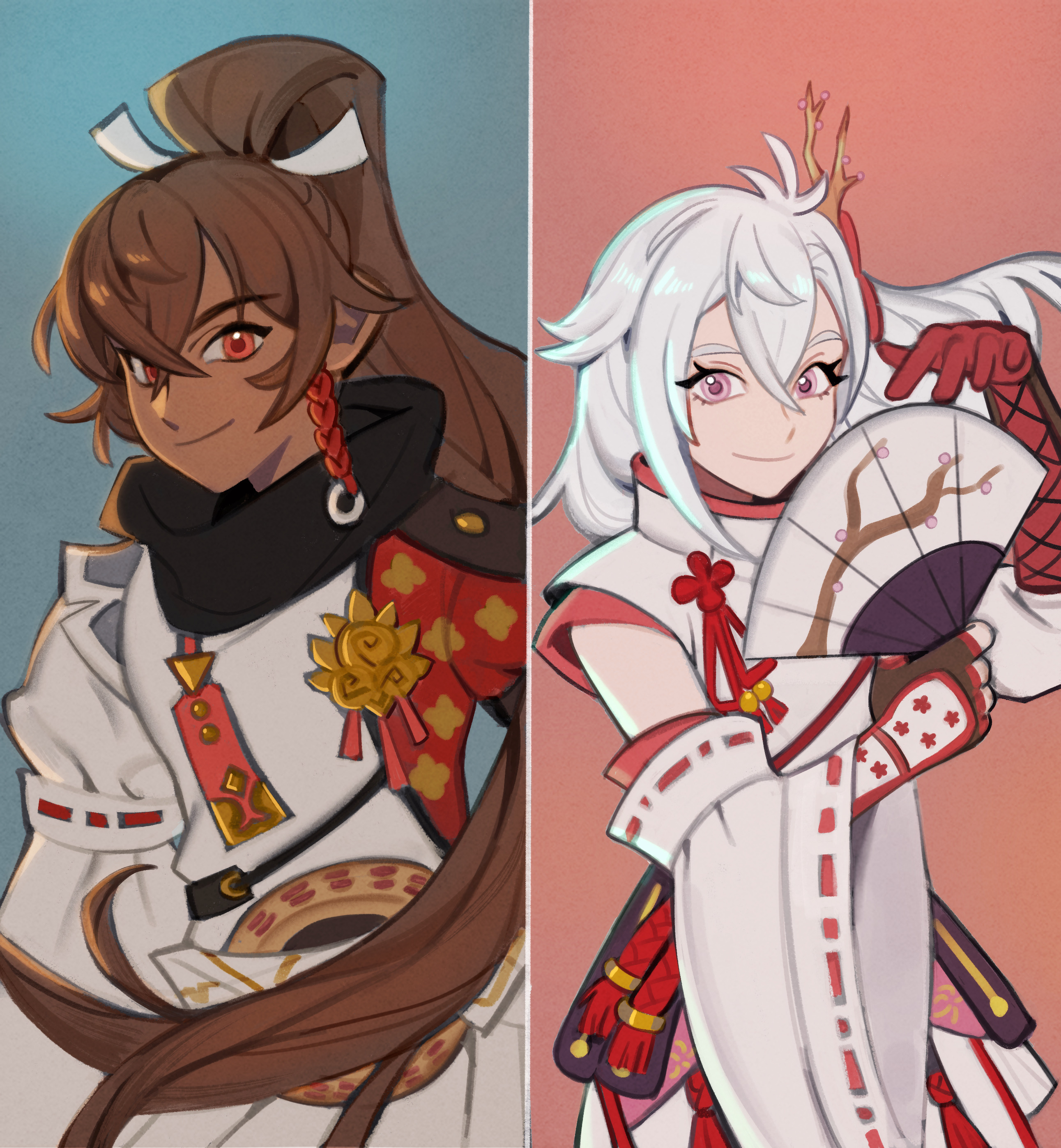 1boy 1girl absurdres brown_hair commentary hair_between_eyes hand_fan highres holding holding_fan japanese_clothes kaguya_(rune_factory) purple_eyes rune_factory rune_factory:_guardians_of_azuma shy-shortcake subaru_(rune_factory) white_hair