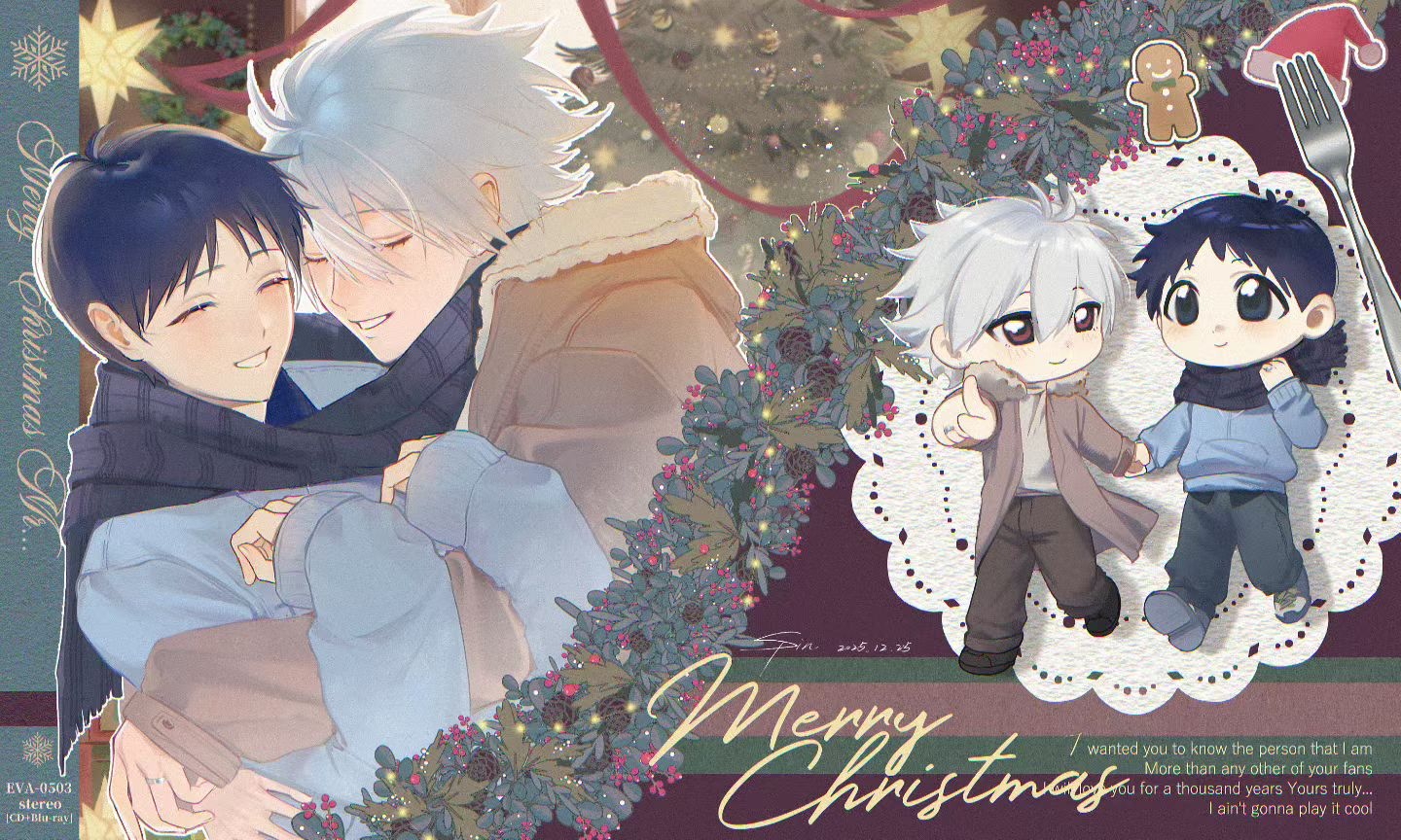 2boys black_male_underwear black_pants blue_eyes blue_hoodie blush christmas_tree closed_eyes closed_mouth coat commentary_request dated deformed english_text fork grey_hair hair_between_eyes happy holding_hands hood hoodie hug ikari_shinji jewelry looking_at_another male_focus male_underwear merry_christmas multiple_boys nagisa_kaworu neon_genesis_evangelion pants red_eyes ring scarf shared_clothes shared_scarf shipin606 shirt short_hair smile teeth underwear wedding_ring white_shirt yaoi