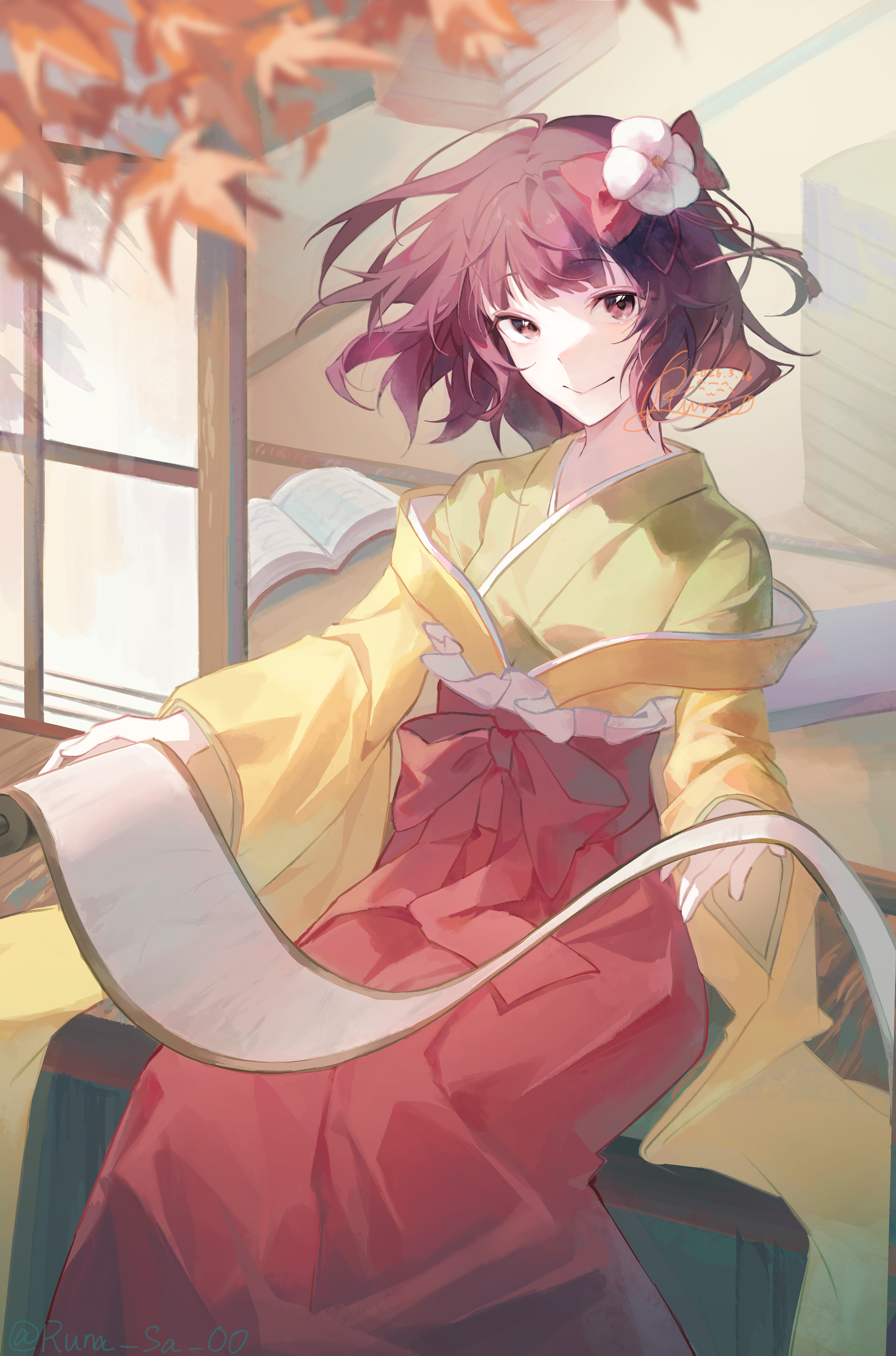 1girl absurdres book closed_mouth commentary commission dated flower_hairpin hakama hakama_skirt hieda_no_akyuu highres holding holding_scroll japanese_clothes kimono leaf looking_at_viewer luna_sakurazuki maple_leaf medium_hair open_book purple_eyes purple_hair scroll signature skeb_commission skirt sliding_doors smile solo touhou