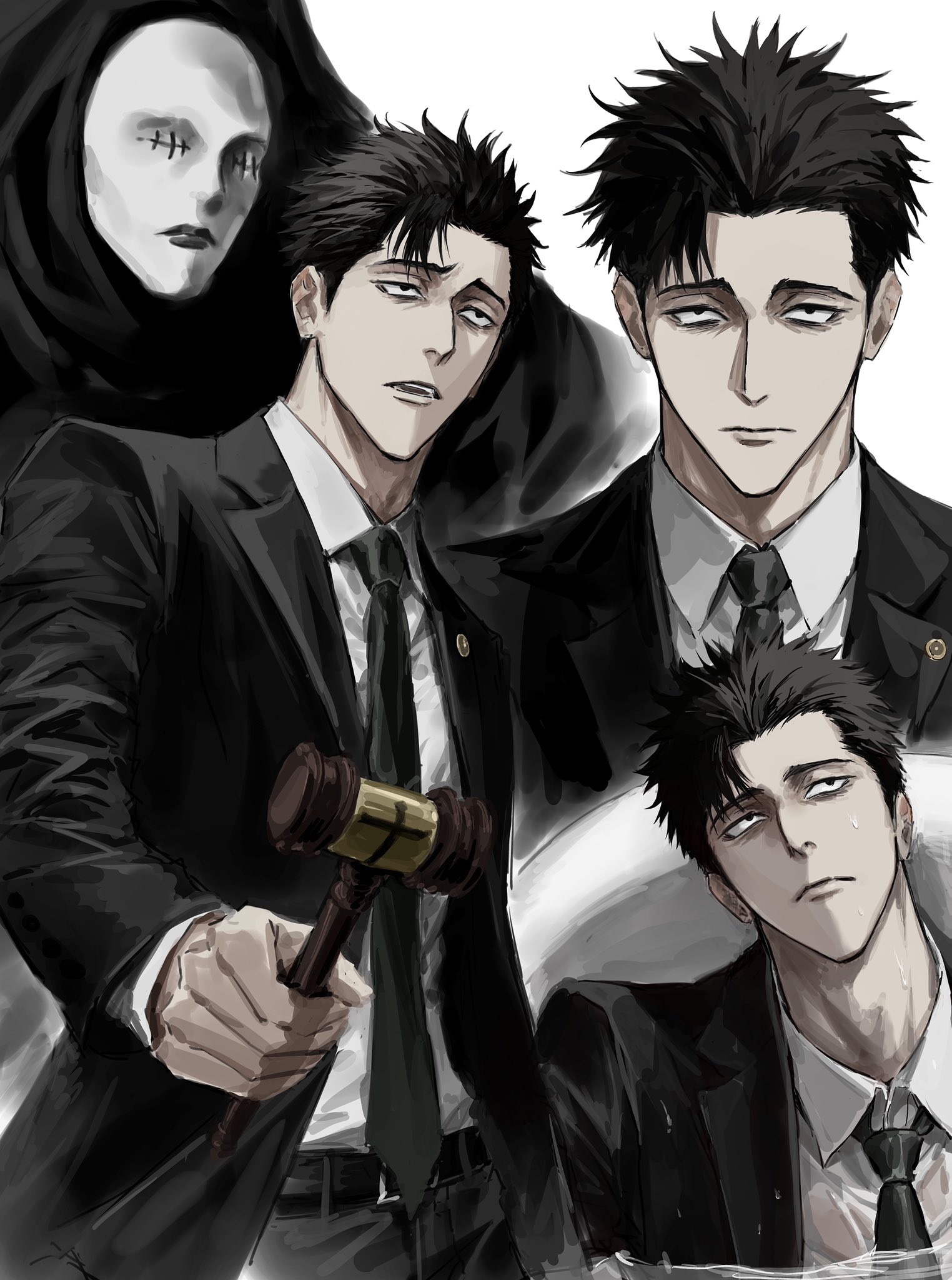 1boy belt black_belt black_hair black_jacket black_necktie black_pants black_suit collared_shirt suit_pants dress_shirt formal_clothes gavel highres higuruma_hiromi holding_gavel in_bathtub jacket jujutsu_kaisen lawyer looking_at_viewer male_focus multiple_views necktie open_mouth pants shirt short_hair simple_background sso_s suit white_background white_shirt