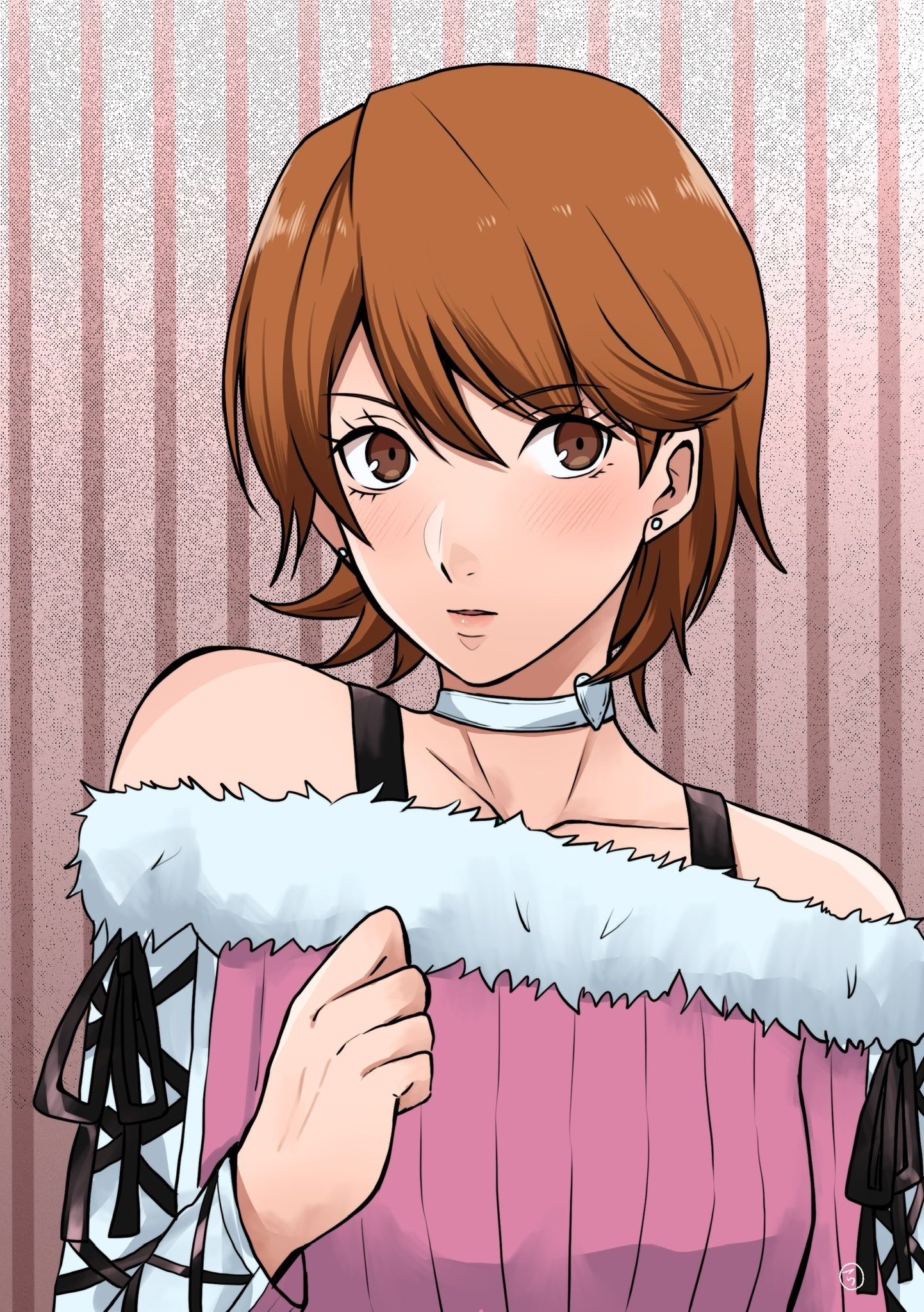 1girl bare_shoulders blush brown_eyes brown_hair choker collarbone commentary cross-laced_clothes cross-laced_sleeves cross-laced_sweater di_amon_d earrings flipped_hair fur-trimmed_sweater fur_trim heart heart_choker highres indoors jewelry long_sleeves looking_at_viewer off-shoulder_sweater off_shoulder official_alternate_costume parted_lips persona persona_3 pink_sweater ribbed_sweater short_hair solo strap stud_earrings sweater takeba_yukari upper_body white_choker