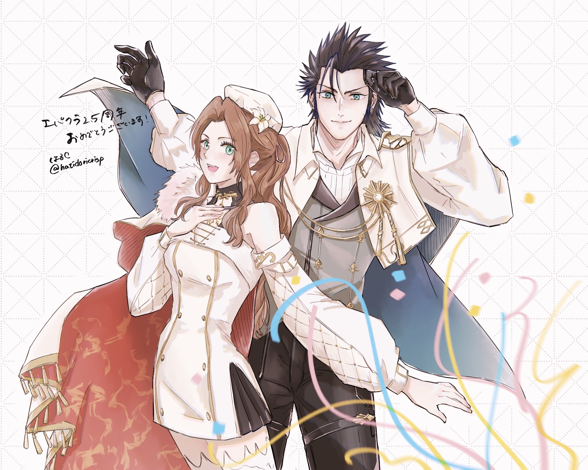 1boy 1girl aerith_gainsborough aerith_gainsborough_(festive_dress) bare_shoulders black_gloves black_hair black_pants blue_eyes blush brown_hair cape commentary_request confetti cowboy_shot detached_sleeves dress final_fantasy final_fantasy_vii final_fantasy_vii:_ever_crisis flower gloves green_eyes grey_vest hat hatidoricrisp highres jacket looking_at_viewer official_alternate_costume open_clothes open_jacket open_mouth pants parted_bangs red_cape sidelocks spiked_hair vest white_dress white_flower white_hat white_jacket white_sleeves zack_fair zack_fair_(festive_jacket)