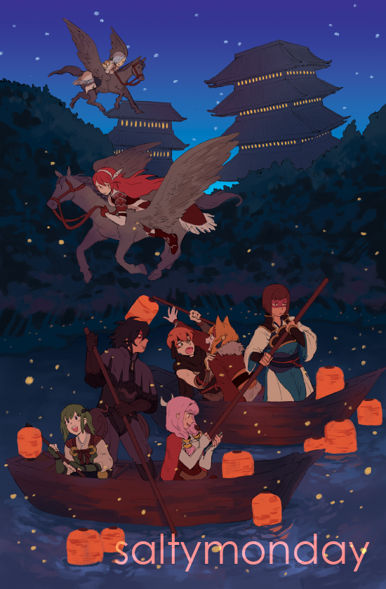 4boys 4girls architecture asugi_(fire_emblem) boat caeldori_(fire_emblem) commentary dwyer_(fire_emblem) east_asian_architecture english_commentary fire_emblem fire_emblem_fates green_hair hisame_(fire_emblem) horseback_riding japanese_clothes lucyisokay midori_(fire_emblem) mitama_(fire_emblem) multiple_boys multiple_girls night nintendo oar on_boat orange_hair pegasus pink_hair red_hair riding selkie_(fire_emblem) shigure_(fire_emblem) sky star_(sky) starry_sky water watercraft