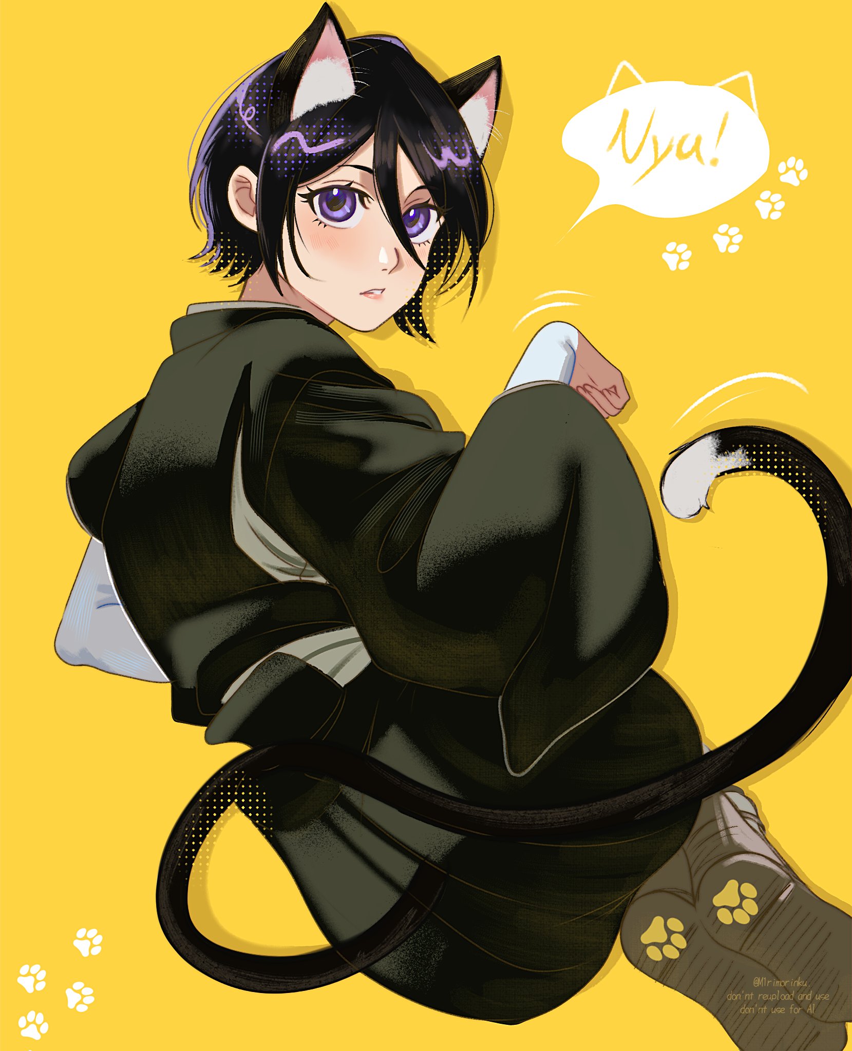 1girl animal_ears black_hakama bleach brown_sandals cat_ears cat_girl cat_tail commentary english_commentary from_behind hair_between_eyes hakama highres japanese_clothes kemonomimi_mode kuchiki_rukia looking_back m1rimorinku paw_pose paw_print purple_eyes purple_hair sandals shihakusho short_hair solo tail watermark yellow_background