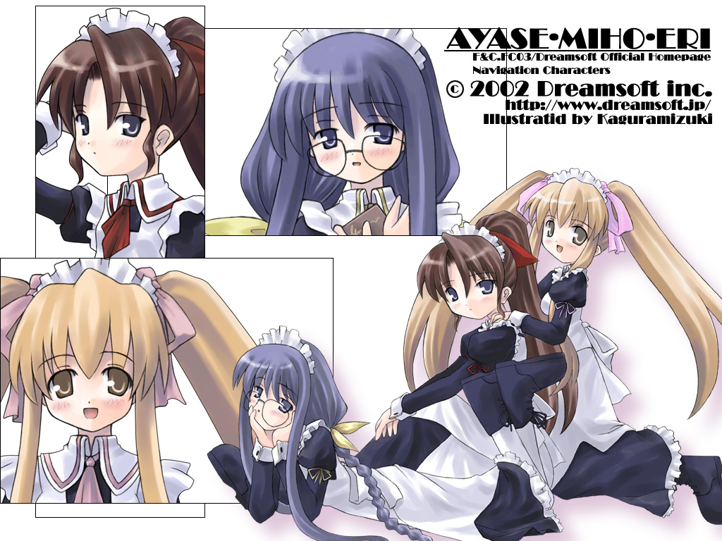 3girls apron arm_up artist_name ascot black_boots black_dress black_eyes blonde_hair blue_eyes blue_hair blush book boots bow braid brown_eyes brown_hair character_name closed_mouth copyright_notice dated dreamsoft dress endou_miho_(dreamsoft) feet_up glasses hair_bow hair_ribbon hands_on_another's_shoulders hands_on_own_face head_rest holding holding_book hoshikawa_eri juliet_sleeves kagura_mizuki long_hair long_sleeves looking_at_viewer looking_to_the_side low-braided_long_hair low-tied_long_hair lying maid maid_headdress multiple_girls nishimiya_ayase official_art official_wallpaper on_stomach open_mouth outdoors pantyhose parted_lips pink_ascot pink_bow ponytail puffy_short_sleeves puffy_sleeves red_ascot red_bow ribbon short_sleeves sitting sleeve_cuffs smile twin_braids twintails watermark web_address white_apron white_pantyhose yellow_ascot yellow_bow