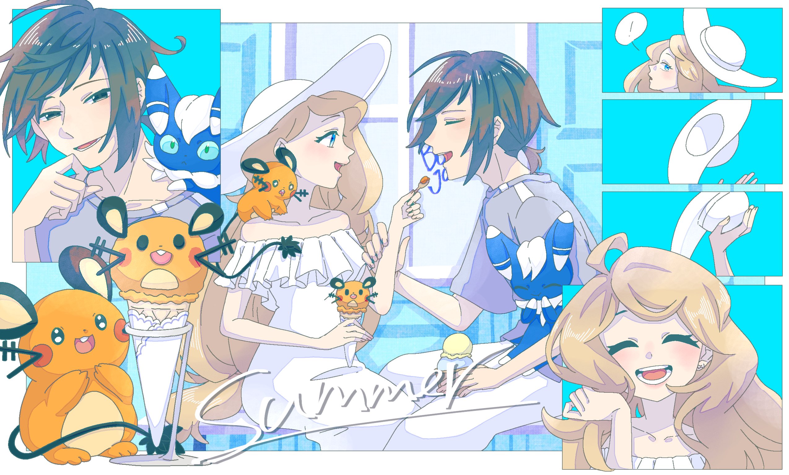 1boy 1girl alternate_costume black_hair blonde_hair calem_(pokemon) character-themed_food closed_eyes commentary_request dedenne dress feeding food gen_6_pokemon grey_shirt hat hetero highres ice_cream meowstic meowstic_(male) nintendo open_mouth pokemon pokemon_(creature) pokemon_x_and_y ponytail serena_(pokemon) shirt short_ponytail sun_hat tsugomori_oekk white_dress