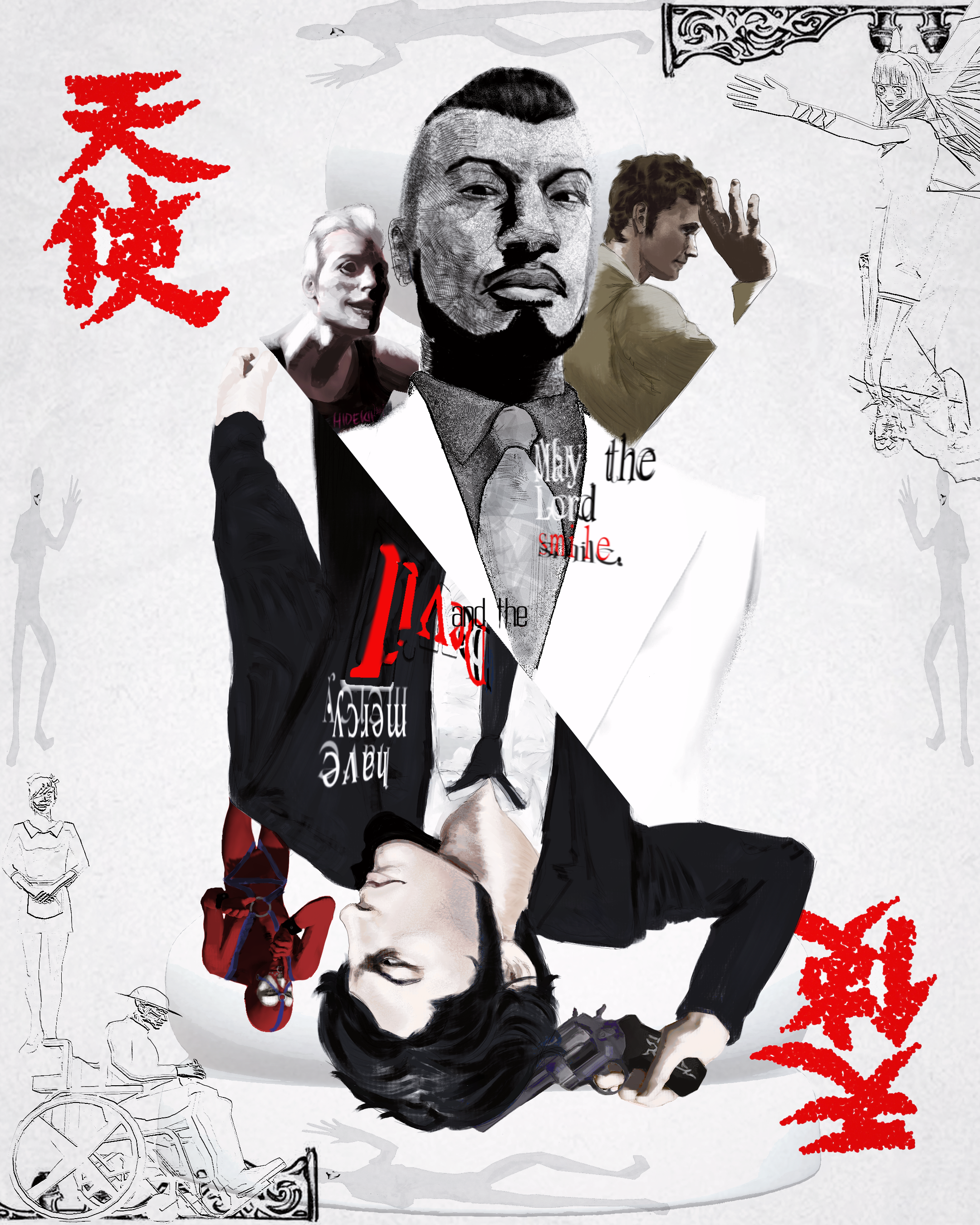 2girls 6+boys absurdres angel_(killer7) beard black_hair bodysuit christopher_mills closed_mouth dan_smith english_text facial_hair finger_to_mouth garcian_smith gun handgun harman_smith hidekii_ii highres holding holding_gun holding_weapon iwazaru jacket killer7 long_sleeves male_focus multiple_boys multiple_girls mustache necktie red_bodysuit revolver samantha_sitbon short_hair sideburns travis_bell upside-down weapon wheelchair