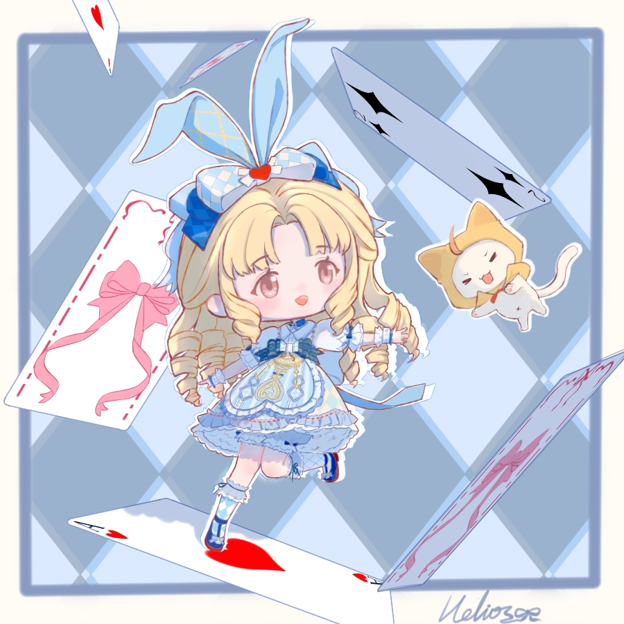 >_< 1girl ace_(playing_card) ace_of_hearts ahoge animal animal_ear_hairband animal_ears apron argyle_background argyle_bow argyle_clothes argyle_skirt blonde_hair bloomers blue_apron blue_background blue_bow blue_hairband blue_ribbon blue_shoes blue_socks border bow bowtie brown_eyes card cat chibi chinese_commentary cloak clothed_animal collared_shirt colored_skin commentary_request dress_shirt drill_hair ear_covers eyelashes fake_animal_ears frilled_apron frilled_bloomers frilled_skirt frilled_sleeves frilled_socks frilled_wrist_cuffs frills grey_bloomers hair_bow hair_ornament hairband happy heart heart_hair_ornament helios_youyouran high-waist_skirt hood hood_up hooded_cloak infinity_nikki kneehighs light_blush lolita_fashion long_hair looking_at_animal mary_janes momo_(nikki) multicolored_skin navel nikki_(series) open_mouth outline outside_border outstretched_arm parted_bangs playing_card puffy_short_sleeves puffy_sleeves rabbit_ear_hairband rabbit_ears red_bow red_bowtie rewound_daydream_(infinity_nikki) ribbon ribbon_legwear shirt shoes short_sleeves sidelocks signature skirt sleeve_bow smile socks solo tareme teeth traditional_bowtie two-tone_skin two-tone_socks underwear upper_teeth_only variant_set very_long_hair waist_apron waist_bow white_border white_cat white_outline white_shirt white_socks white_wrist_cuffs wrist_cuffs yellow_cloak