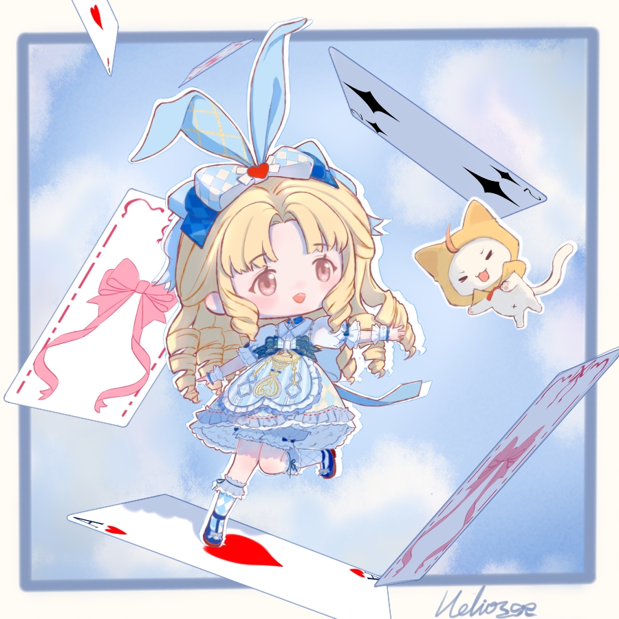 >_< 1girl ace_(playing_card) ace_of_hearts ahoge animal animal_ear_hairband animal_ears apron argyle_bow argyle_clothes argyle_skirt blonde_hair bloomers blue_apron blue_bow blue_hairband blue_ribbon blue_shoes blue_sky blue_socks border bow bowtie brown_eyes card cat chibi chinese_commentary cloak clothed_animal cloud collared_shirt colored_skin commentary_request dress_shirt drill_hair ear_covers eyelashes fake_animal_ears frilled_apron frilled_bloomers frilled_skirt frilled_sleeves frilled_socks frilled_wrist_cuffs frills grey_bloomers hair_bow hair_ornament hairband happy heart heart_hair_ornament helios_youyouran high-waist_skirt hood hood_up hooded_cloak infinity_nikki kneehighs light_blush lolita_fashion long_hair looking_at_animal mary_janes momo_(nikki) multicolored_skin navel nikki_(series) open_mouth outline outside_border outstretched_arm parted_bangs playing_card puffy_short_sleeves puffy_sleeves rabbit_ear_hairband rabbit_ears red_bow red_bowtie rewound_daydream_(infinity_nikki) ribbon ribbon_legwear shirt shoes short_sleeves sidelocks signature skirt sky sleeve_bow smile socks solo tareme teeth traditional_bowtie two-tone_skin two-tone_socks underwear upper_teeth_only variant_set very_long_hair waist_apron waist_bow white_border white_cat white_outline white_shirt white_socks white_wrist_cuffs wrist_cuffs yellow_cloak