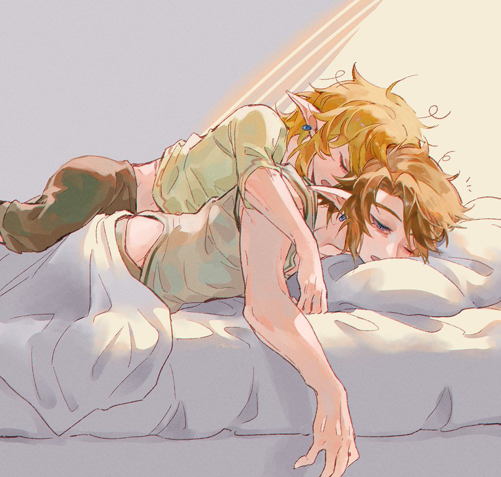 2boys bed blonde_hair blue_eyes closed_eyes commentary_request earrings jewelry link male_focus multiple_boys nintendo open_mouth pillow pointy_ears rain_rkgk sidelocks simple_background sleeping the_legend_of_zelda the_legend_of_zelda:_tears_of_the_kingdom the_legend_of_zelda:_twilight_princess yaoi