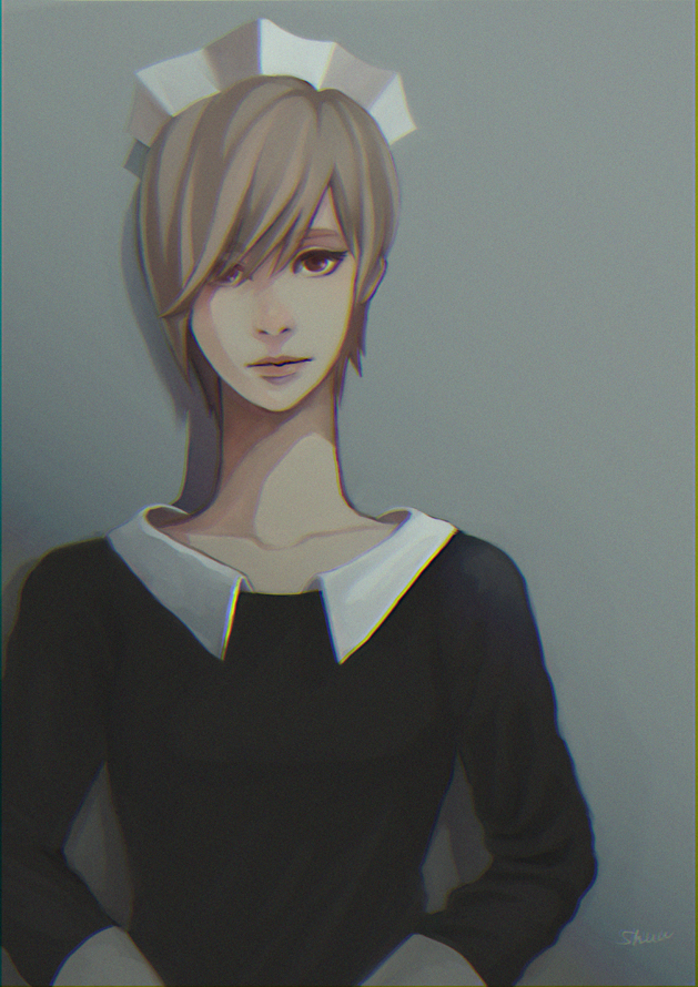 1girl artist_name black_shirt blonde_hair brown_eyes closed_mouth commentary_request expressionless killer7 lips long_sleeves looking_at_viewer maid maid_headdress samantha_sitbon shadow shirt short_hair shuu_(272100) signature solo upper_body