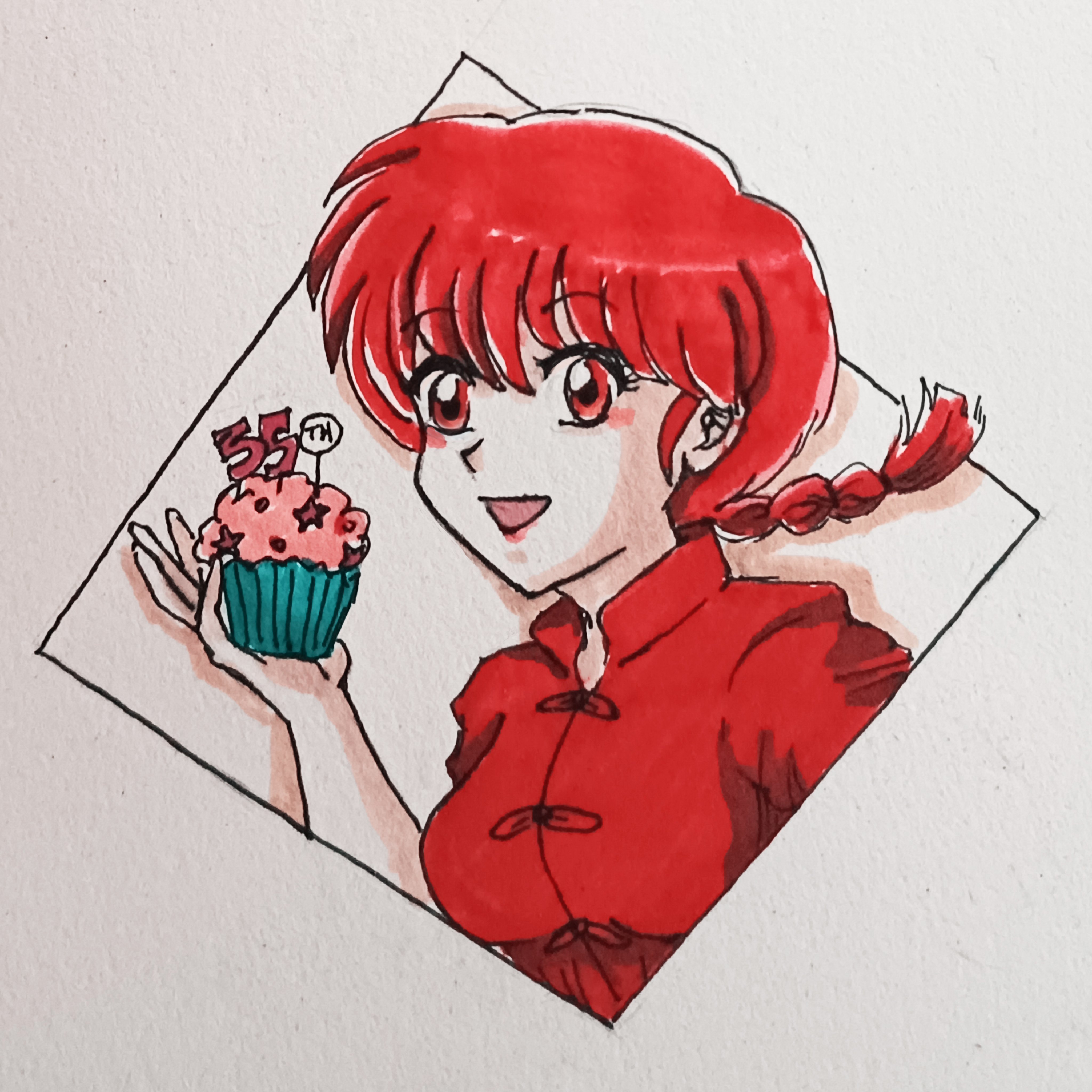 1girl :d absurdres braid cake chinese_clothes cupcake food highres holding holding_cake holding_food ohmagaby open_mouth photo_(medium) ranma-chan ranma_1/2 red_eyes red_hair single_braid smile solo spanish_commentary traditional_media upper_body