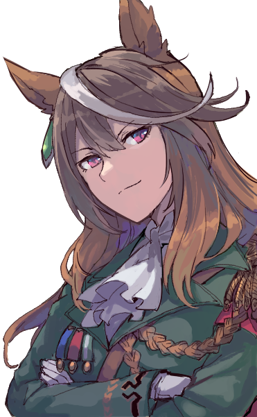 1girl aiguillette animal_ears ascot brown_hair buttons cape closed_mouth commentary_request crossed_arms double-breasted epaulettes green_jacket hair_between_eyes horse_ears horse_girl jacket kusanagi_kaoru long_hair long_sleeves looking_at_viewer medal multicolored_hair purple_eyes red_cape side_cape simple_background single_epaulette smile streaked_hair symboli_rudolf_(emperor's_path)_(umamusume) symboli_rudolf_(umamusume) umamusume upper_body white_ascot white_background white_hair