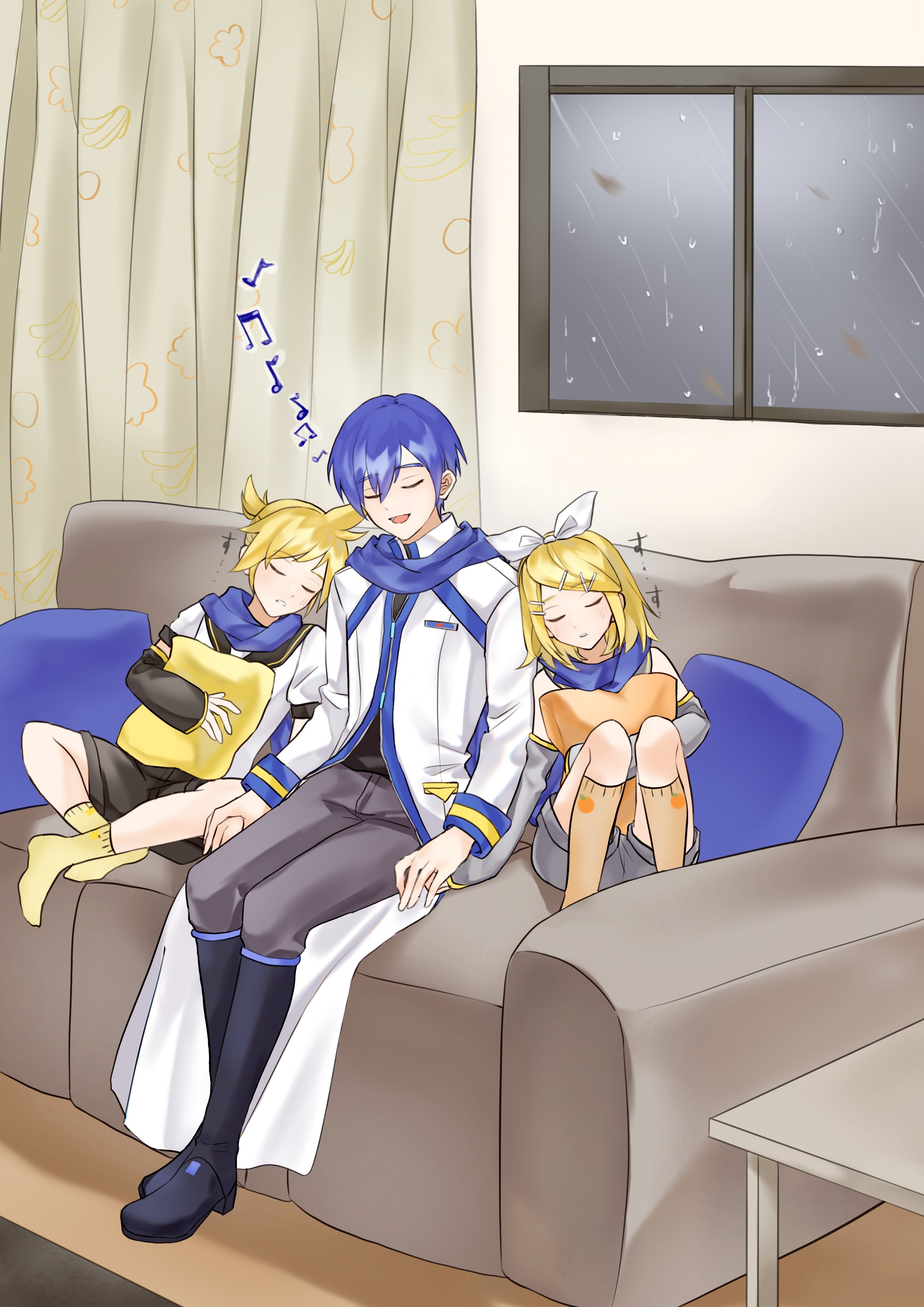1girl 2boys 6_chair absurdres bare_shoulders beamed_eighth_notes black_boots black_sailor_collar black_shoes black_sleeves blonde_hair blue_hair blue_scarf blue_trim boots bow closed_eyes coat commentary couch curtains detached_sleeves eighth_note grey_pants grey_shorts grey_sleeves hair_between_eyes hair_bow hair_ornament hairclip high_collar highres holding holding_hands holding_pillow indian_style indoors kagamine_len kagamine_rin kaito_(vocaloid) kaito_(vocaloid3) kneehighs knees_up leaning_on_person light_blush long_sleeves multiple_boys music musical_note no_shoes on_couch open_mouth orange_socks pants parallel_hairclips parted_lips pillow ponytail puffy_short_sleeves puffy_sleeves rain sailor_collar scarf shared_clothes shared_scarf shirt shoes short_hair short_ponytail short_sleeves shorts singing sitting sleeping sleeveless sleeveless_shirt smile snoring socks vocaloid white_bow white_coat white_shirt window yellow_socks