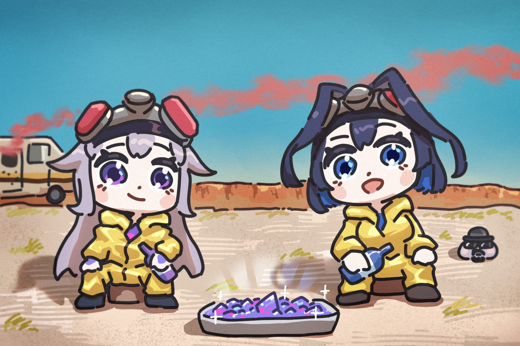 1other 2girls bing_huyue blue_hair blue_sky blush_stickers bottle breaking_bad camper_trailer chest_jewel desert facial_hair gas_mask gem goatee hair_flaps hair_intakes hand_jewel hat hazmat_suit highres hololive hololive_english jumpsuit koseki_bijou long_hair mask mesa multiple_girls new_mexico open_mouth ouro_kronii purple_eyes purple_gem purple_hair recreational_vehicle respirator short_hair sitting sky smoke trailer united_states very_long_hair virtual_youtuber yellow_jumpsuit