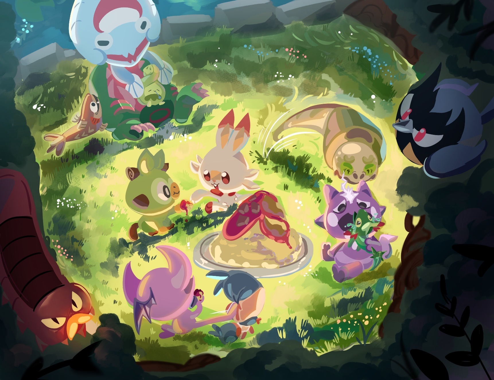:3 arrokuda blipbug budew closed_mouth commentary dracovish dreepy eating english_commentary food gen_4_pokemon gen_8_pokemon grass grookey highres holding holding_food holding_pokemon impidimp in_the_face kicking nintendo no_humans nostrils open_mouth outdoors plate pokemon pokemon_(creature) rookidee scorbunny silicobra sitting sizzlipede smile suraelis toxel