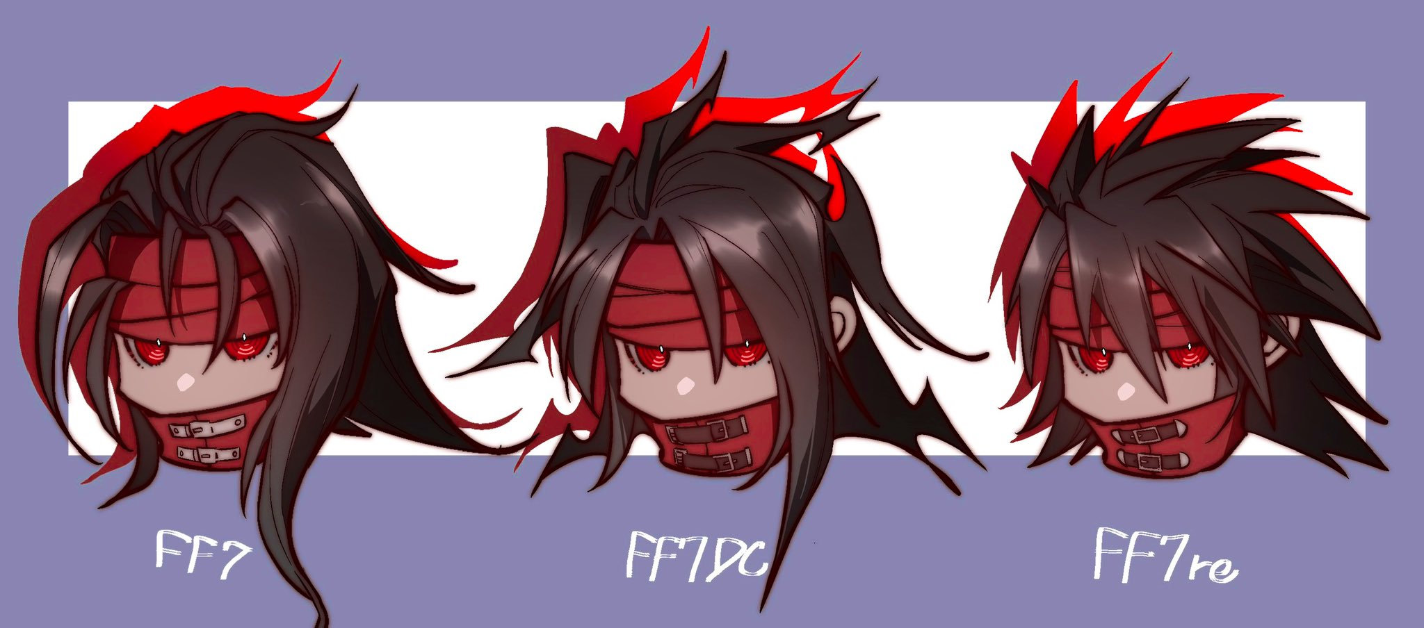 black_hair border chibi chibi_only cloak commentary_request copyright_name cropped_head dirge_of_cerberus:_final_fantasy_vii final_fantasy final_fantasy_vii final_fantasy_vii_rebirth final_fantasy_vii_remake hair_between_eyes headband highres kelland0526 long_hair male_focus messy_hair multiple_views purple_border red_cloak red_eyes red_headband solo spiked_hair vincent_valentine white_background