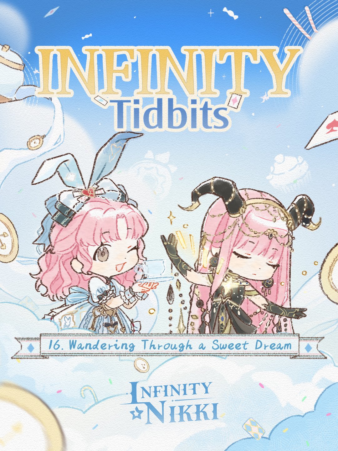 2girls ace_(playing_card) ace_of_spades animal_ears apron artist_request back_bow beads black_bow black_dress black_gloves black_horns blue_apron blue_bow blue_hairband blue_skirt blue_sky blue_wrist_cuffs blunt_bangs bow brown_eyes candy candy_cane card chibi cinnamon_stick circlet clock closed_eyes closed_mouth cloud collared_shirt commentary copyright_logo cup curled_horns day dot_nose dress dual_persona earrings elbow_gloves english_commentary eyelashes floating_card floppy_ears food frilled_apron frilled_skirt frilled_sleeves frilled_wrist_cuffs frills gloves goat_horns gold_choker hair_beads hair_bow hair_ornament hairband heart heart_hair_ornament highres holding holding_saucer horns infinity_nikki jewelry lace-trimmed_bow lace_trim light_frown logo lolita_fashion long_hair medium_skirt multiple_girls night_capricorn_song_(infinity_nikki) nikki_(nikki) nikki_(series) official_art one_eye_closed open_mouth outdoors outstretched_arm parted_bangs pink_hair playing_card pouring print_skirt puffy_short_sleeves puffy_sleeves rabbit_ears rewound_daydream_(infinity_nikki) saucer second-party_source shirt short_sleeves skirt sky sleeve_bow sleeveless sleeveless_dress smile spade_(shape) sprinkles straight_hair striped_bow tareme teacup teapot title two-tone_bow waist_apron wavy_hair white_shirt wrist_cuffs yellow_hairband