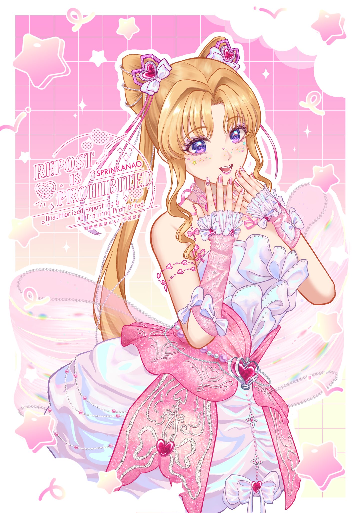 1girl arm_bow arm_warmers artist_name back_bow bare_shoulders bead_armlet blonde_hair border bow bow_in_eye bubble_skirt commentary cone_hair_bun cowboy_shot double_bun dreamtime_bestowed_(infinity_nikki) dress dress_bow english_commentary eyelashes frilled_arm_warmers frills gem gem_hair_ornament gradient_background grid_background hair_bow hair_bun hair_intakes hair_ribbon hands_on_own_chin happy heart-shaped_gem highres infinity_nikki large_bow layered_dress lipstick long_hair looking_at_viewer makeup medium_dress nail_polish nao_(sprinkanao) neck_ribbon nikki_(series) open_mouth outline parted_bangs pink_arm_warmers pink_background pink_bow pink_dress pink_gem pink_lips pink_nails pink_ribbon purple_eyes ribbon see-through_bow sidelocks skirt sleeveless sleeveless_dress smile solo spaghetti_strap sparkle sprinkles standing star_(symbol) striped_bow teeth twintails two-tone_background very_long_hair watermark wavy_hair white_border white_bow white_dress white_outline wrist_bow yellow_background